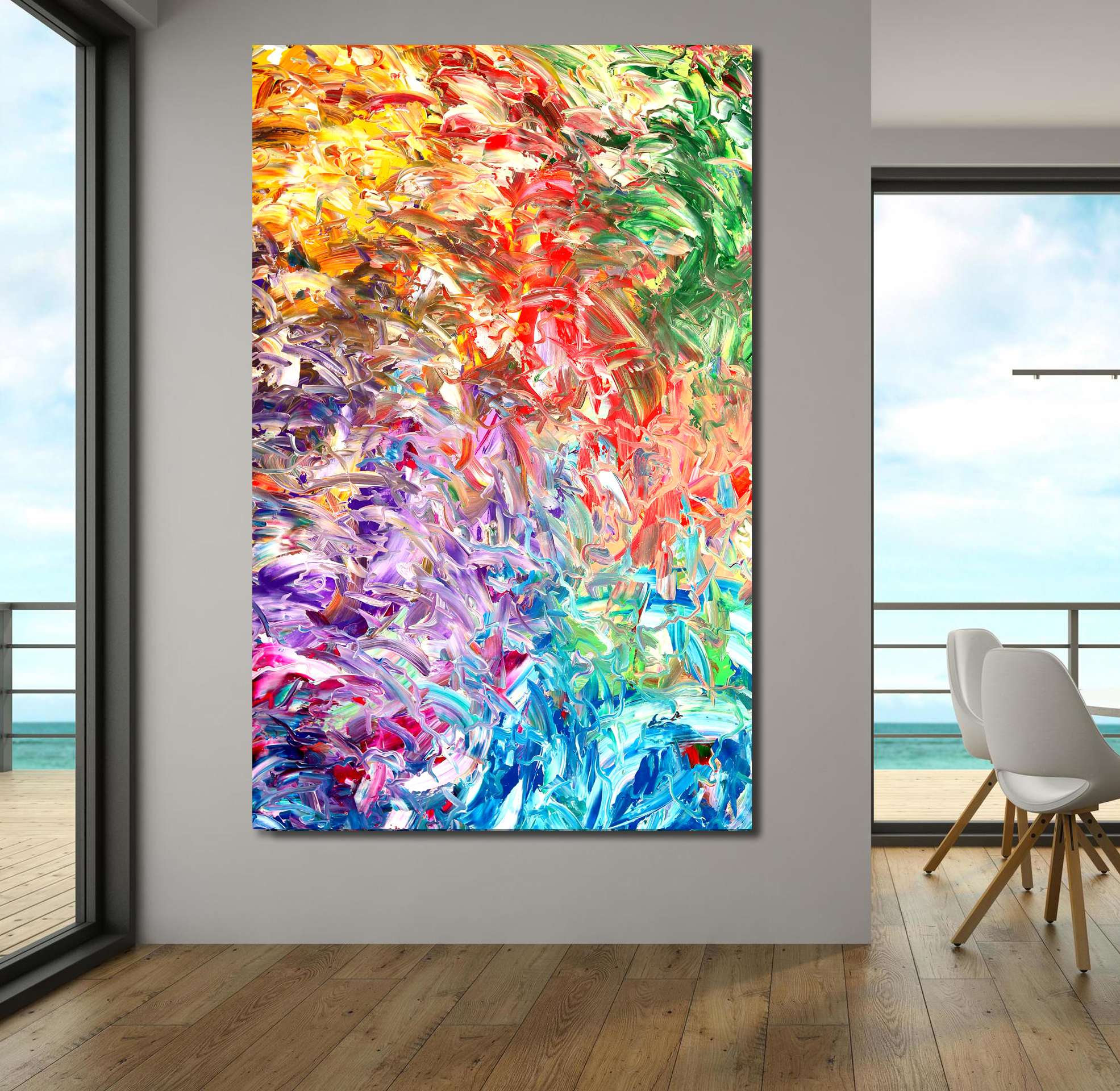 The canvas is 106.7 cm (W) x 167.6 cm (H). The sides are painted in the same manner as the painting and so there is no need for a frame.