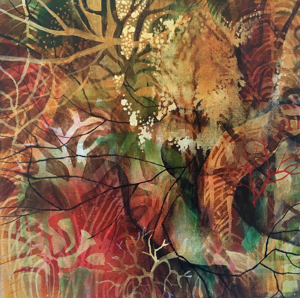 Reveal was painted during a season of deep personal transformation, times of darkness and shadows. The life-pulse I felt in the natural elements of my environment pushed their way through into the work. Love of nature was initially expressed through splashed colours; wild, untamed and spontaneous…. followed by a more considered process of observing trees, leaves and light which guided the organic layers in the work.