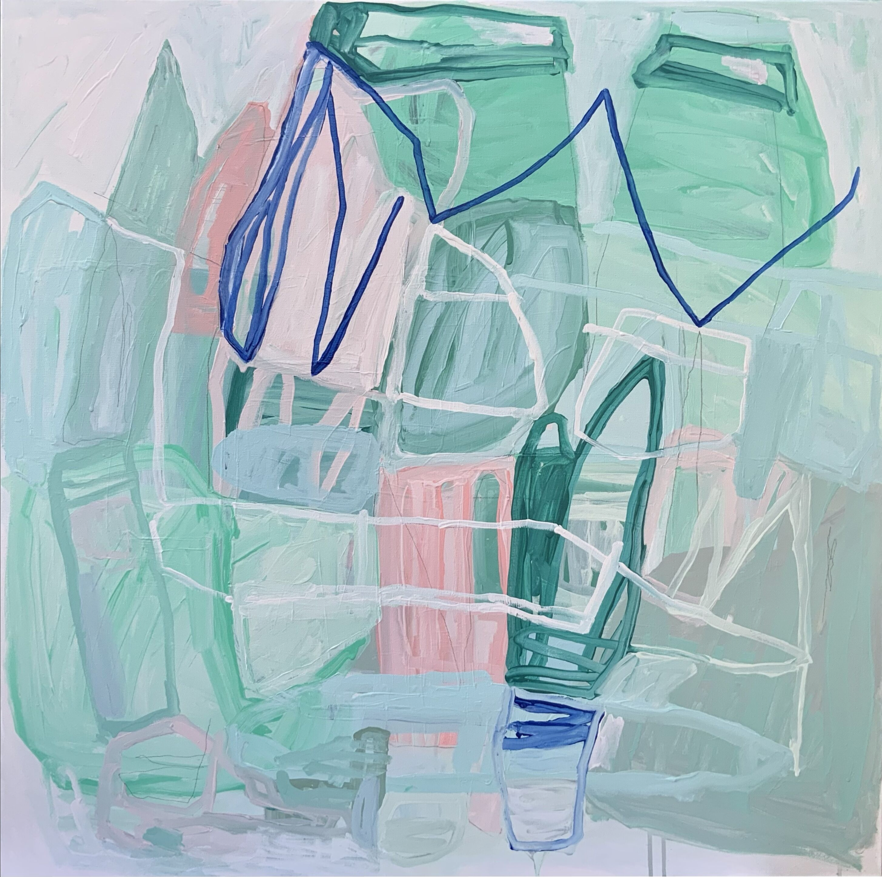 ‘Revered’ is an abstract landscape capturing the essence of nature’s vibrancy. Shades of fresh greens invoke the tranquility of lush landscapes, while blues hint at the serenity of clear skies and bodies of water. The interplay of colours mirrors the dynamic energy of the natural environment, offering an escape into a realm where the boundaries between art and the organic world seamlessly dissolve. ‘Revered’ invites contemplation and celebration of the ever-changing beauty that surrounds us.