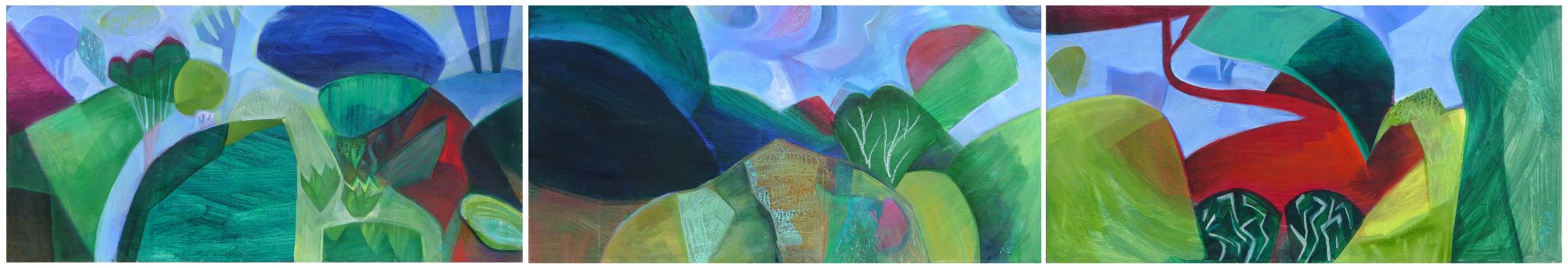 Acrylic triptych comprising three separate cradled plywood panels