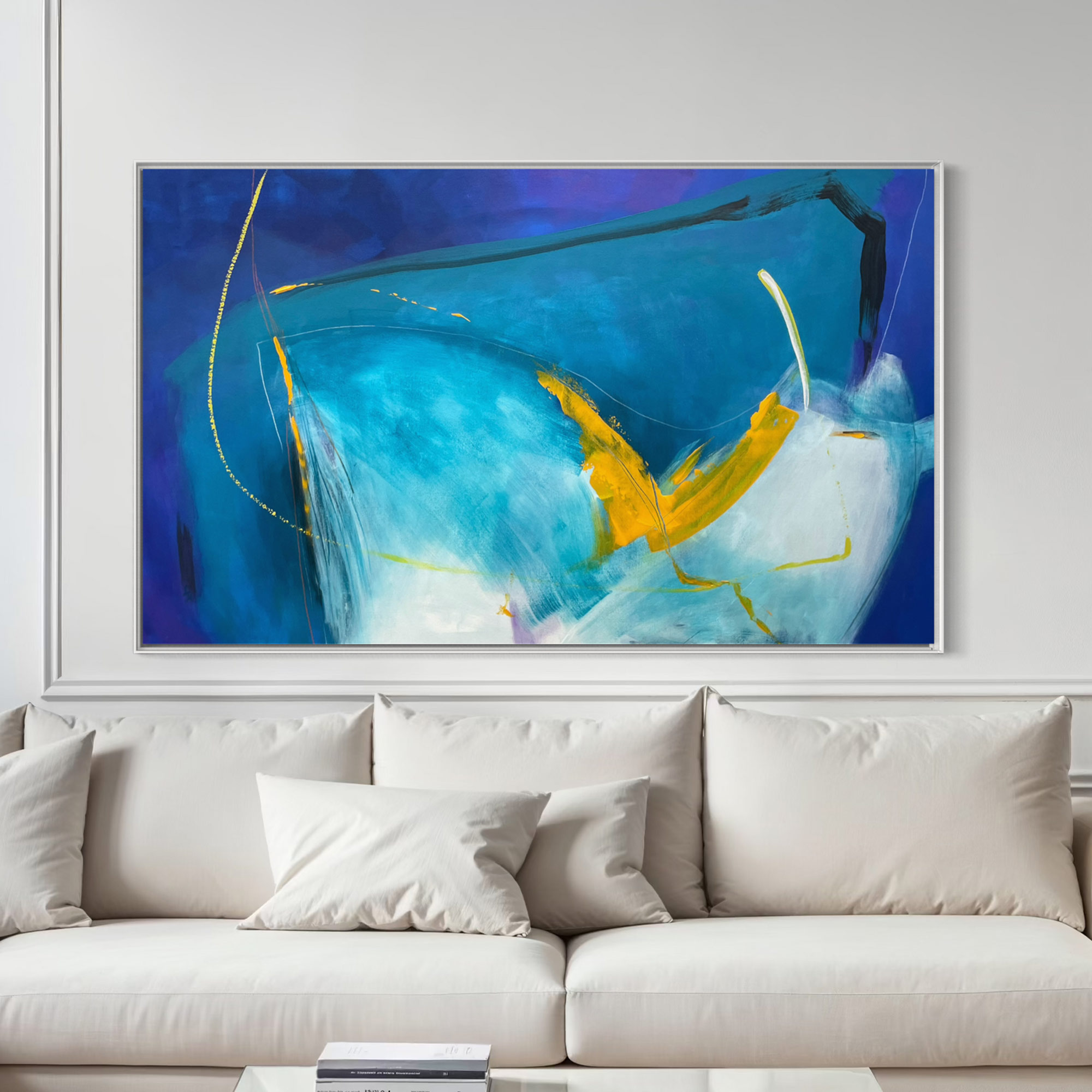 This energetic fusion of acrylic and pencil captures raw emotion in each stroke. The abstract expressionism style pulses with life around the water through its bold contrasts in dark and bright blues, teal, olive and sage green, grey orange, beige and white.