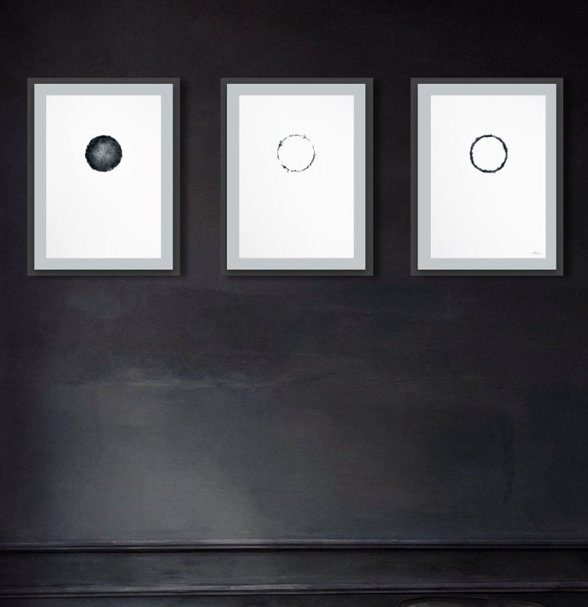 Rhythm and Density by Rihasa Hill – Three circles with their own rhythm and density. The first, a dense cloud with scattered pulses of internal light – like a guiding rhythm in an empty room. The second, only whispers, hovering on the edge of perception – its presence felt more than seen. The third, a solid ring gently binding the scattered foci within. Together, they explore the dynamic interplay of presence and absence, inviting exploration into the unseen spaces.