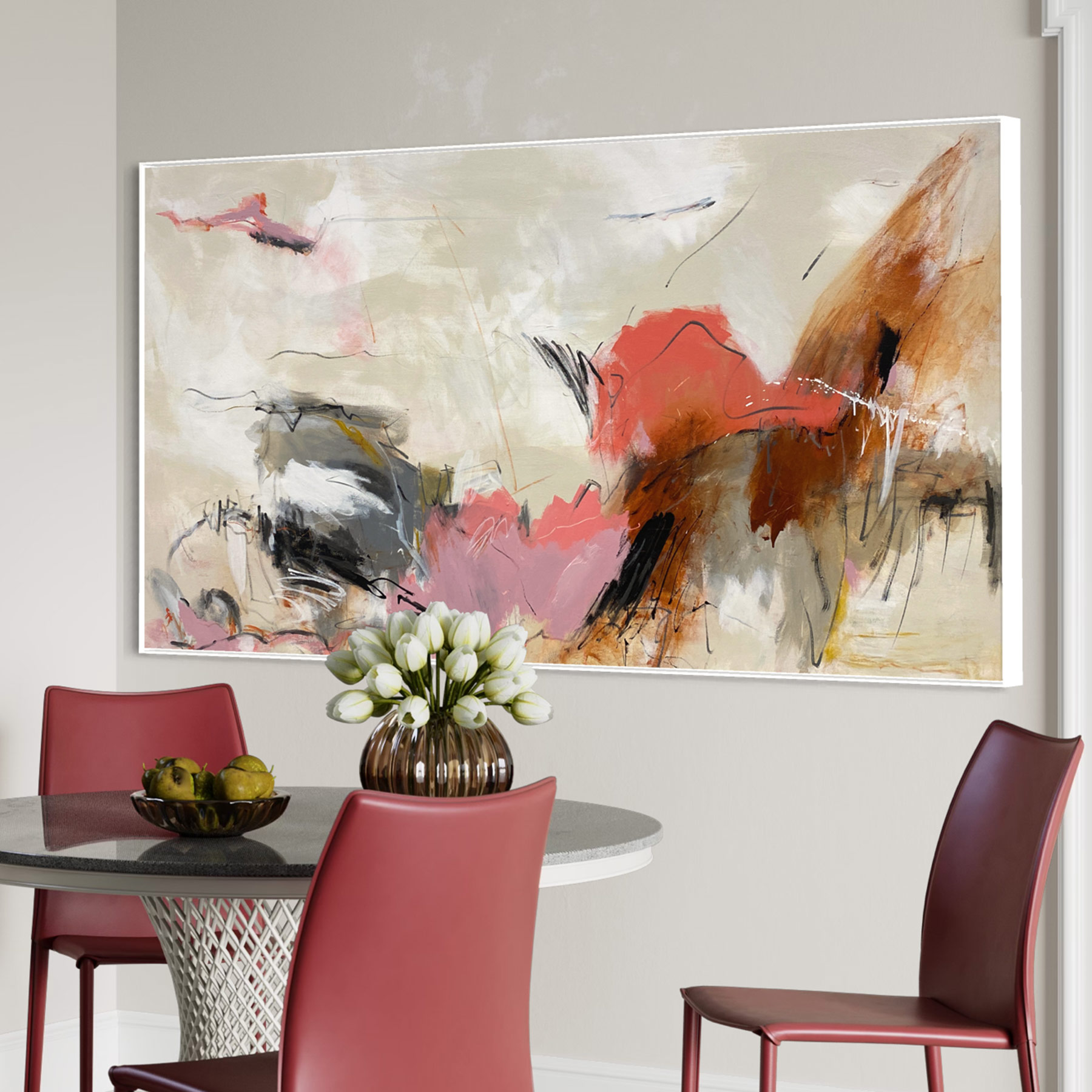 In this piece raw emotion, expressive brushstrokes and spontaneous pencil lines dance across the canvas evoking a sense of gentle movement as the breeze makes its way through the landscape. It’s a conversation between colour and form, rhythm and stillness. This restful palette of apricot, peach, pink, ochre, white, beige, brown, grey, black and neutral tones will infuse your space with a contemplative energy.