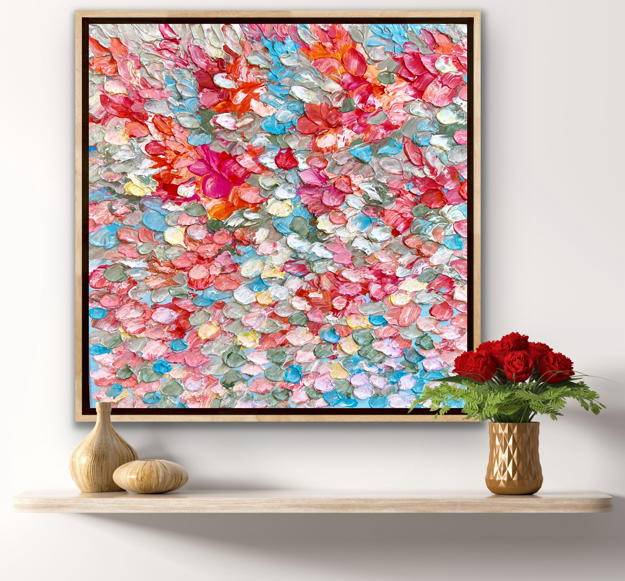 Rhythms of Love by Theo Papathomas is a painting with warm and cool colours of the flowers and petals flying in the wind creating this beautiful bouquet of petals over the landscape with lots of layers of paint. Petals weeping over the landscape creating this veil of petals with so much movement and rhythms. Petals dancing like musical notes over the landscape creating a carpet of colours painted with a pallet knife to create so much texture . A very peaceful and tranquil painting with so much depth .The painting is signed and dated at the back and comes with a certificate of Authenticity.