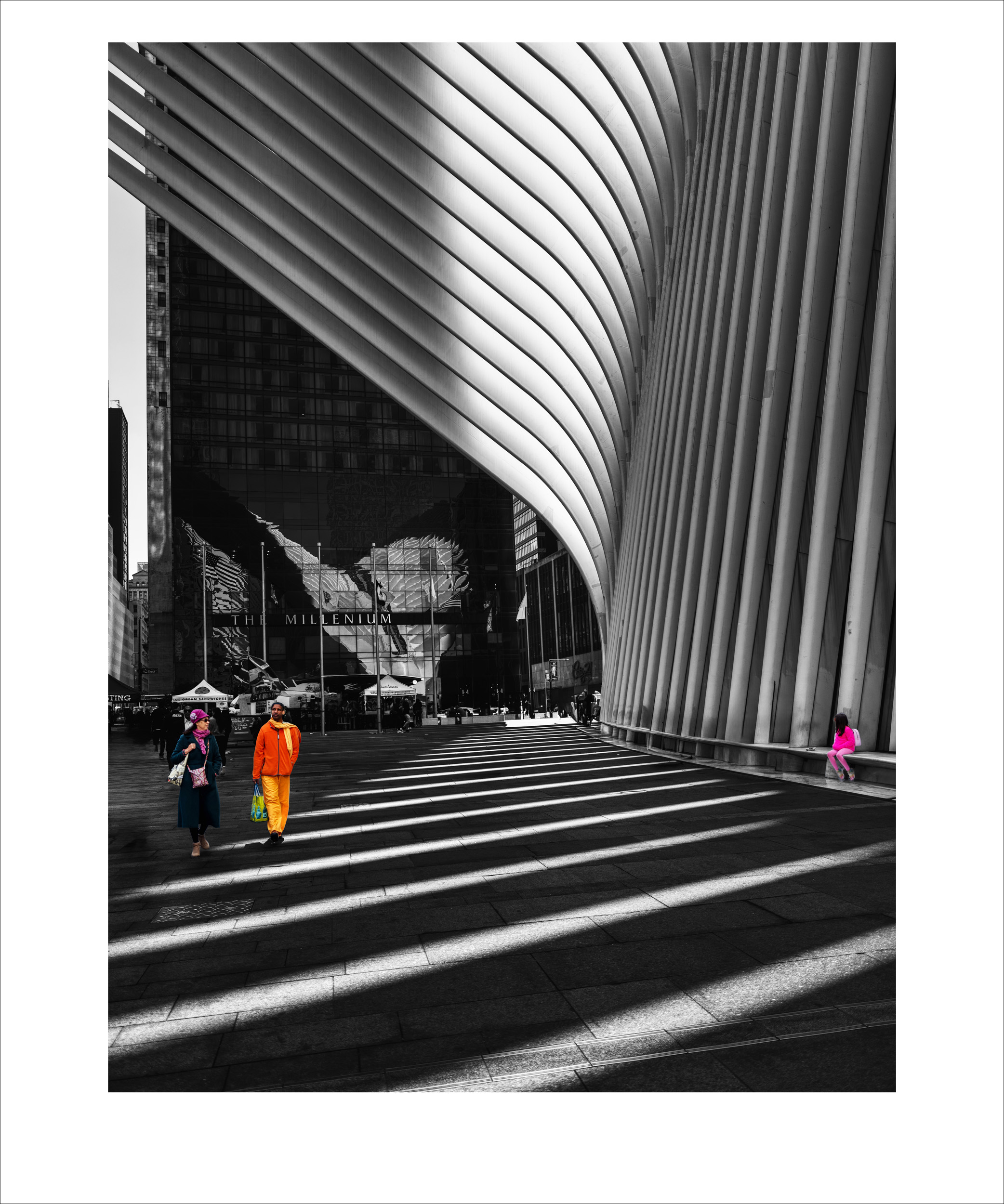 A striking, high-contrast black and white photograph capturing the dramatic architecture of the World Trade Center Oculus in New York City. The massive, curved ribs of the structure frame the composition, casting long, repetitive diagonal shadows across the sunlit plaza. In the foreground, two figures walk, their vibrant clothing (orange and pink) providing a powerful, selective colour accent against the monochrome backdrop, highlighting the human element within the monumental urban design. The Millennium Hilton hotel is reflected in the dark glass of an adjacent building.