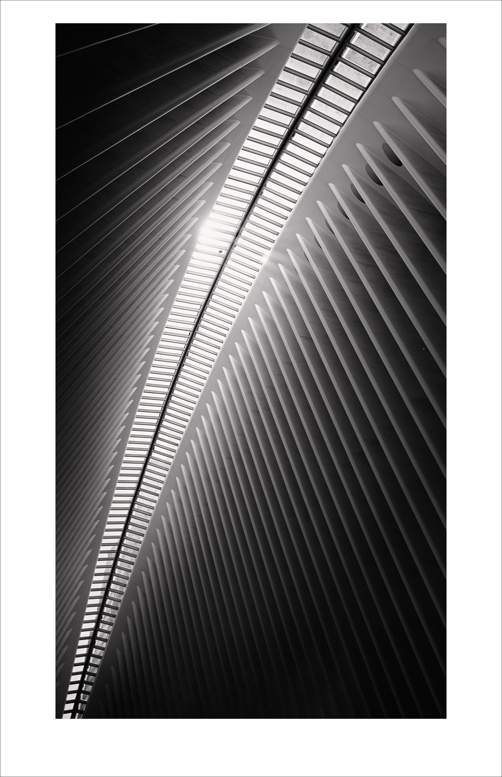 A high-contrast, black and white photograph of the interior architecture of the World Trade Center Oculus (Westfield World Trade Center), focusing on the repeating, skeletal ribs that define the space. A central, diagonal skylight bisects the composition, acting as a luminous anchor against the dark, receding shadows, emphasizing the structure’s grandeur and repeating geometric patterns.