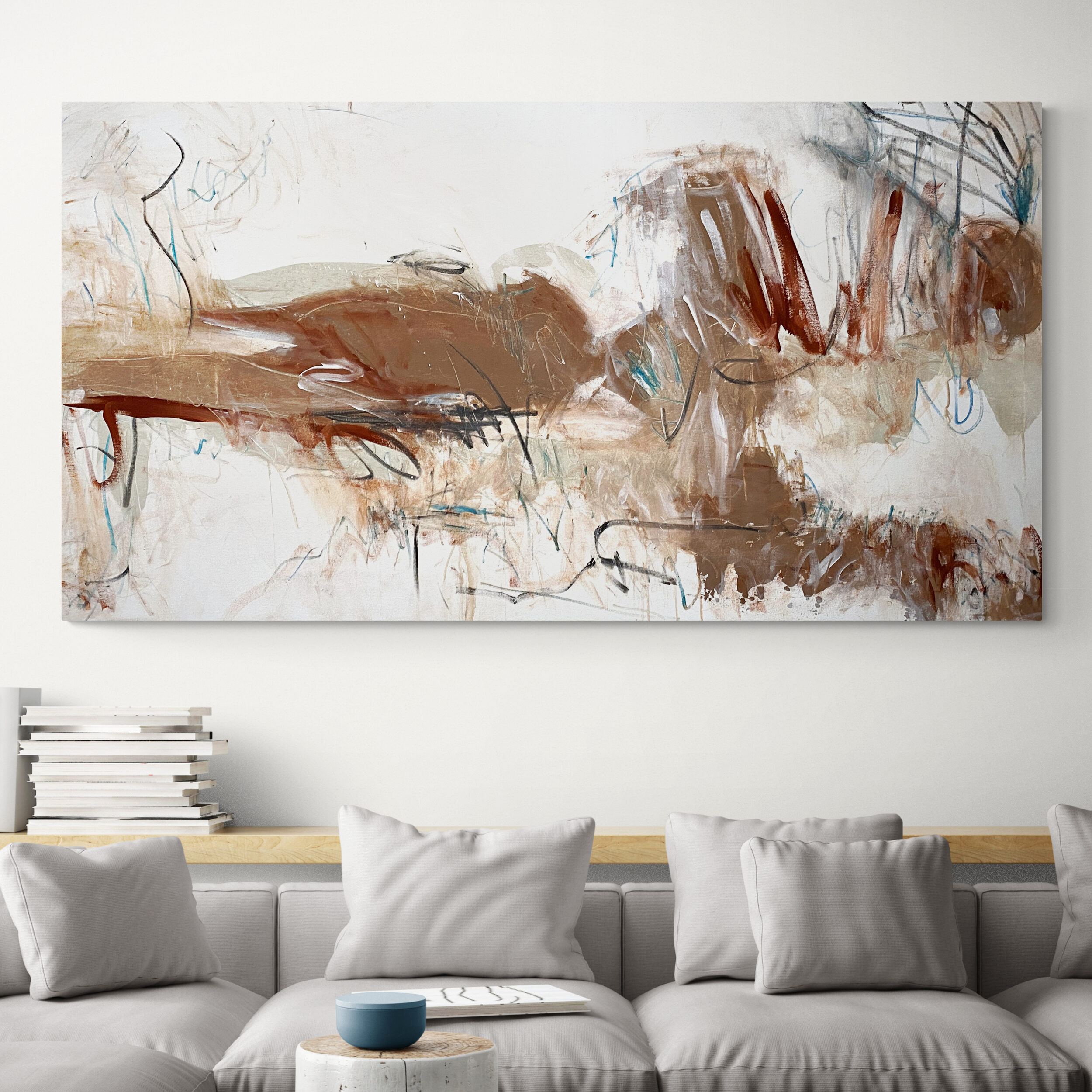 Its vibrant palette of light warm beige and browns, grey, black and white combined with a pops of cool blue and teal makes the bold expressionist mark-making in this piece come alive.