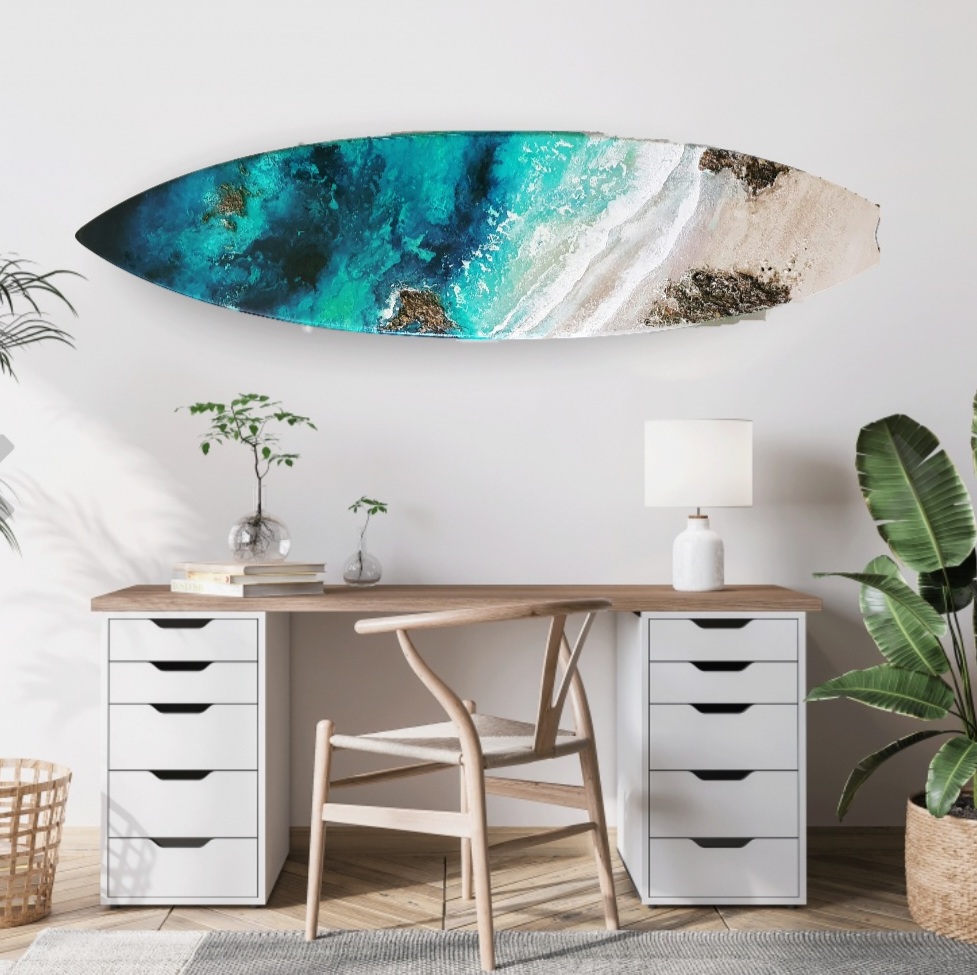 This original ocean resin artwork showcases the beauty of the ocean water and crashing waves. This artwork was created on a pre-loved Town and Country surfboard using professional grade resin, resin pigments, alcohol inks, acrylic paint, real beach sand & textured paste.