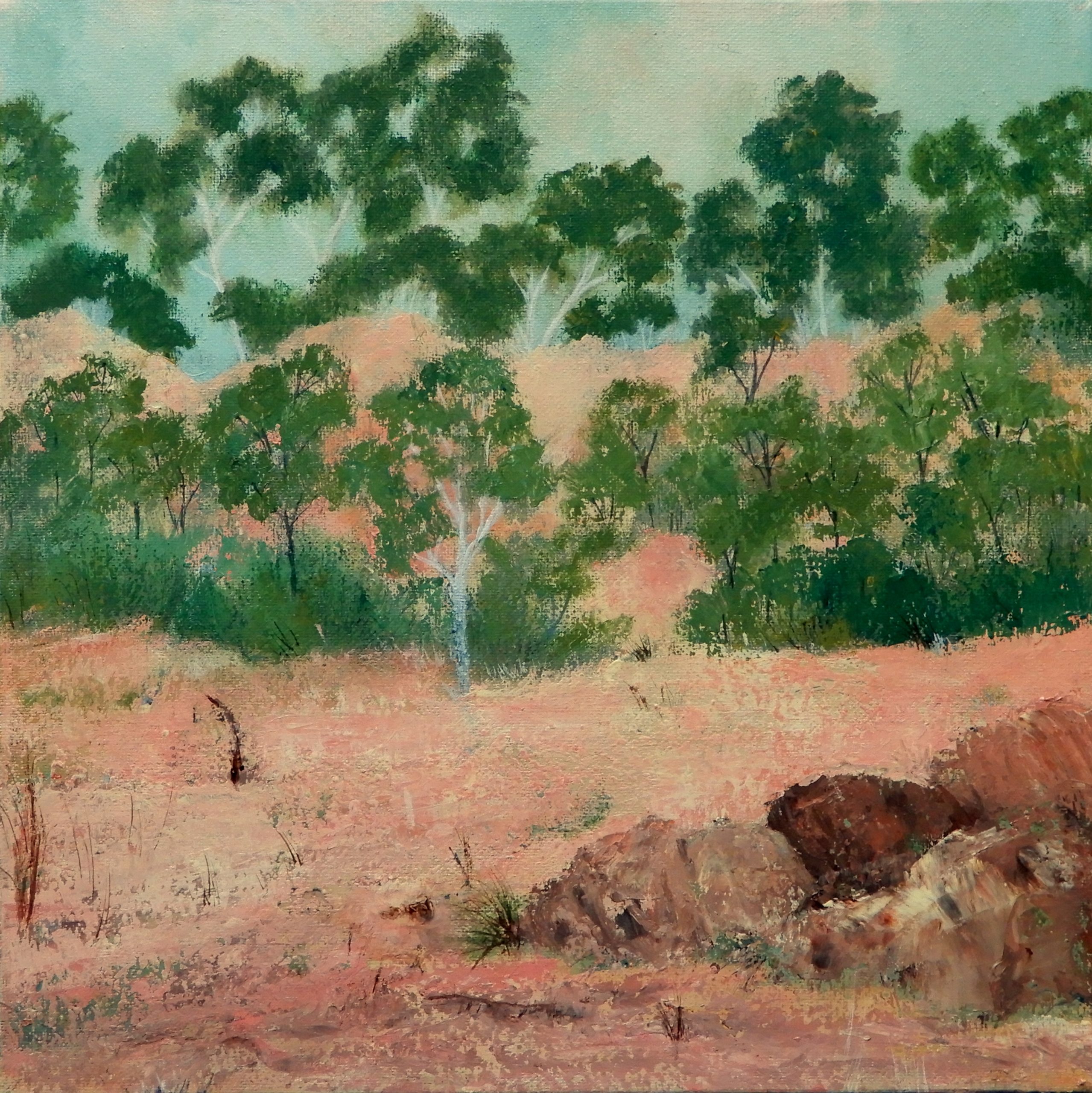 Lovely warm tones of an Australian bush landscape, painted with a palette knife and many layers of paint.