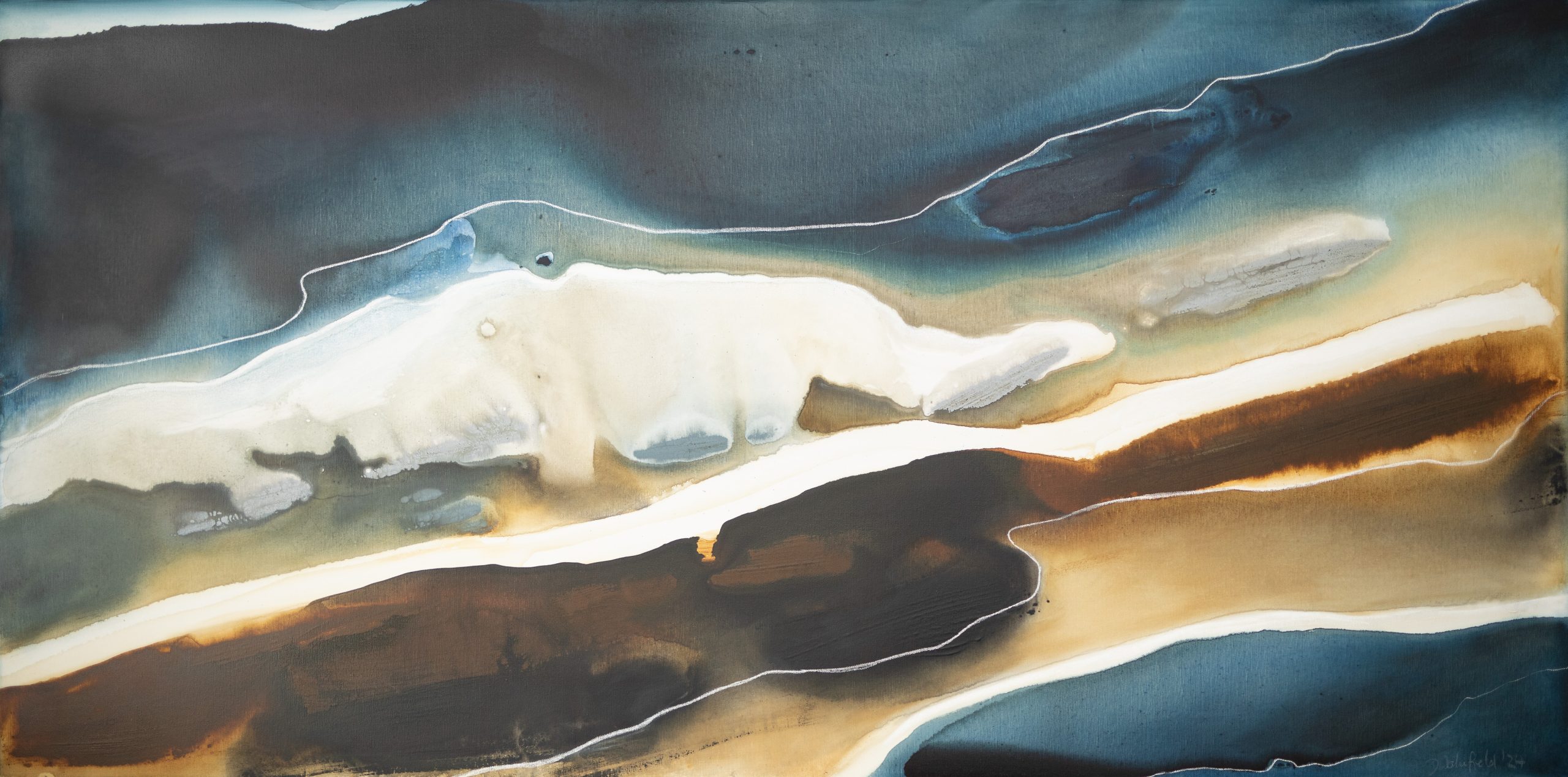 Rift by Dinah Wakefield is inspired by the light, the colours and the natural beauty of the Noosa region of Australia. “What I love most about Noosa is the interplay of light. From the oceans to the clouds, to the river estuaries and the hinterland, this canvas unfolds before me every day and finds expression in my paintings”.