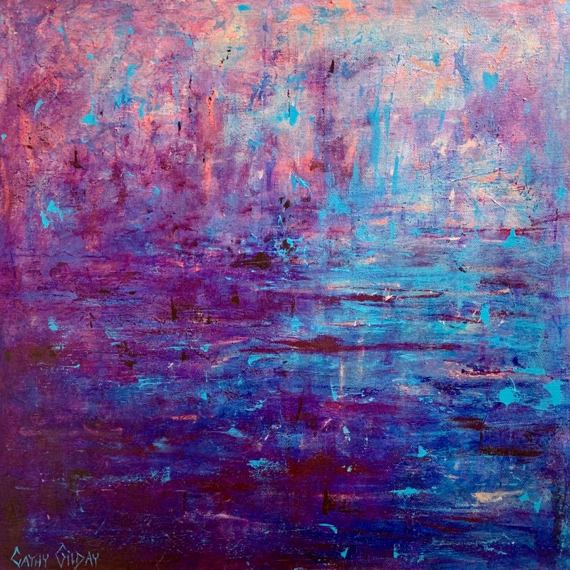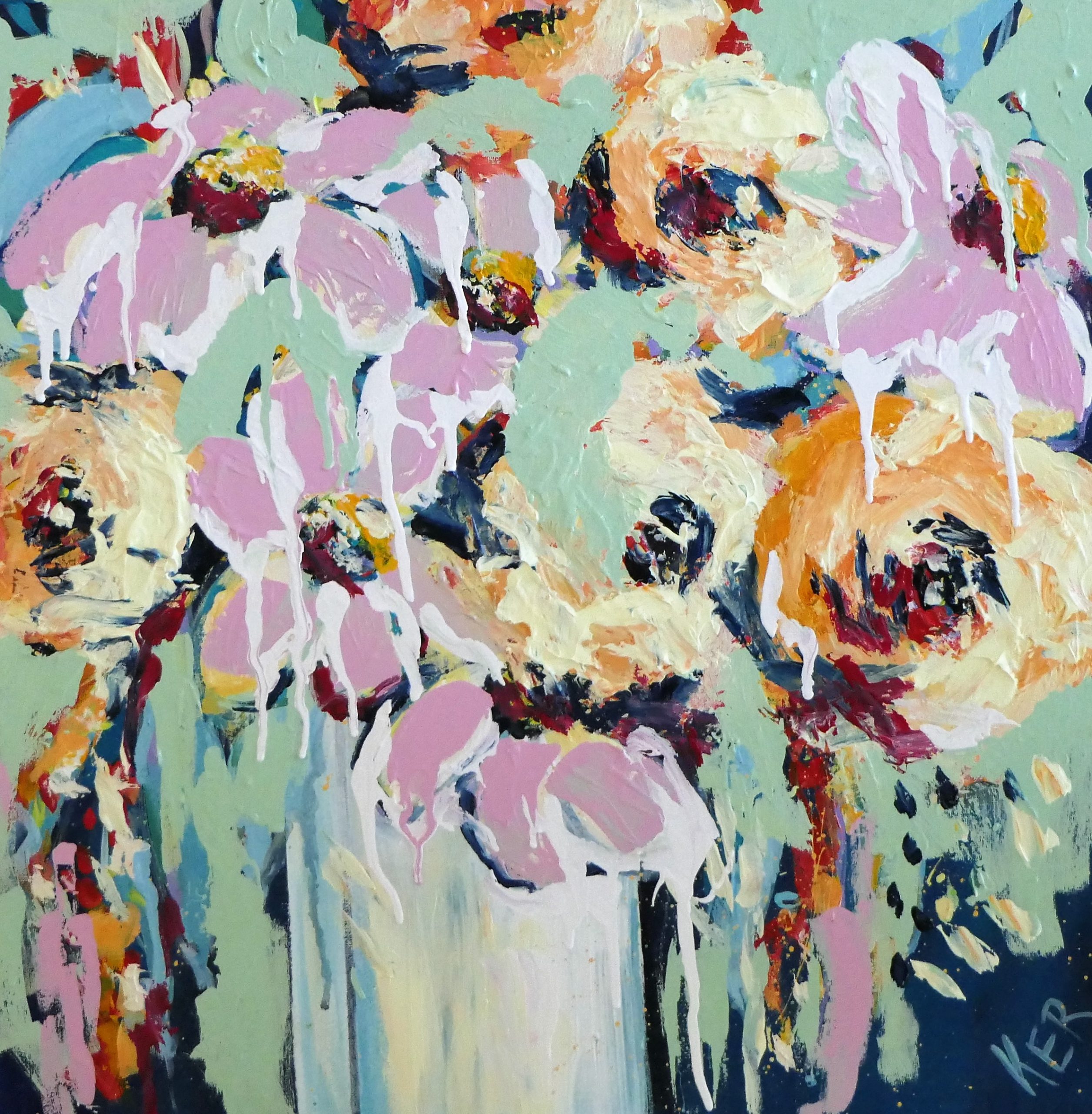 The paint was applied with large brushes and fingers using broad, textured strokes for the blossoms and for the greenery and background. Drips and dabs stayed put and add to the abstracted feel of this work. Colours include violet, pink, pale olive green, teal, orange, white, Prussian blue. The result is a contemporary approach to a contemporary, impressionistic floral work.