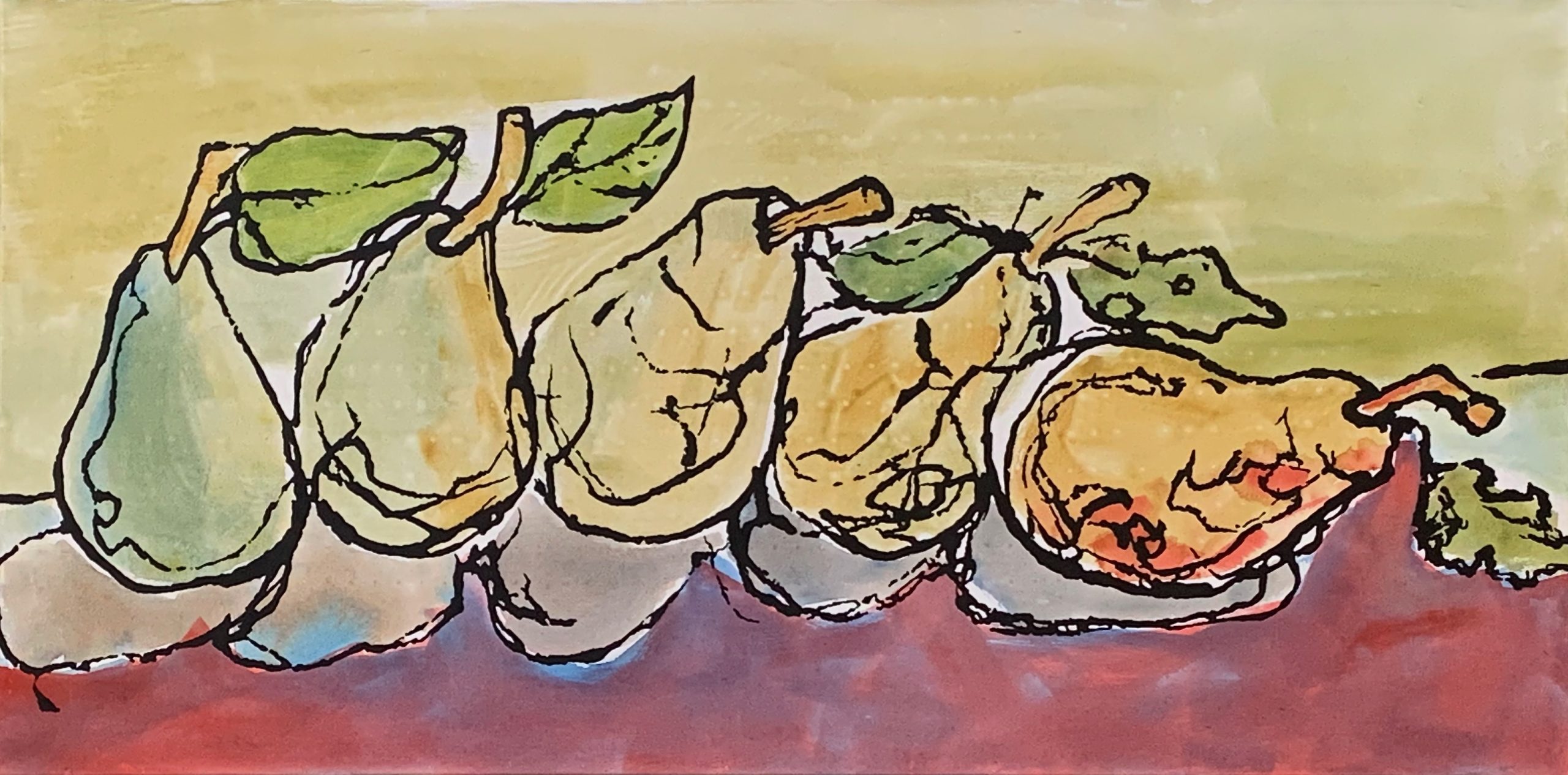 Another in a series of contemporary still life paintings. In this painting I am showing the passage of time as represented by the pears as they change posture and colour. This is a joyous look at maturation because things get better as they age.