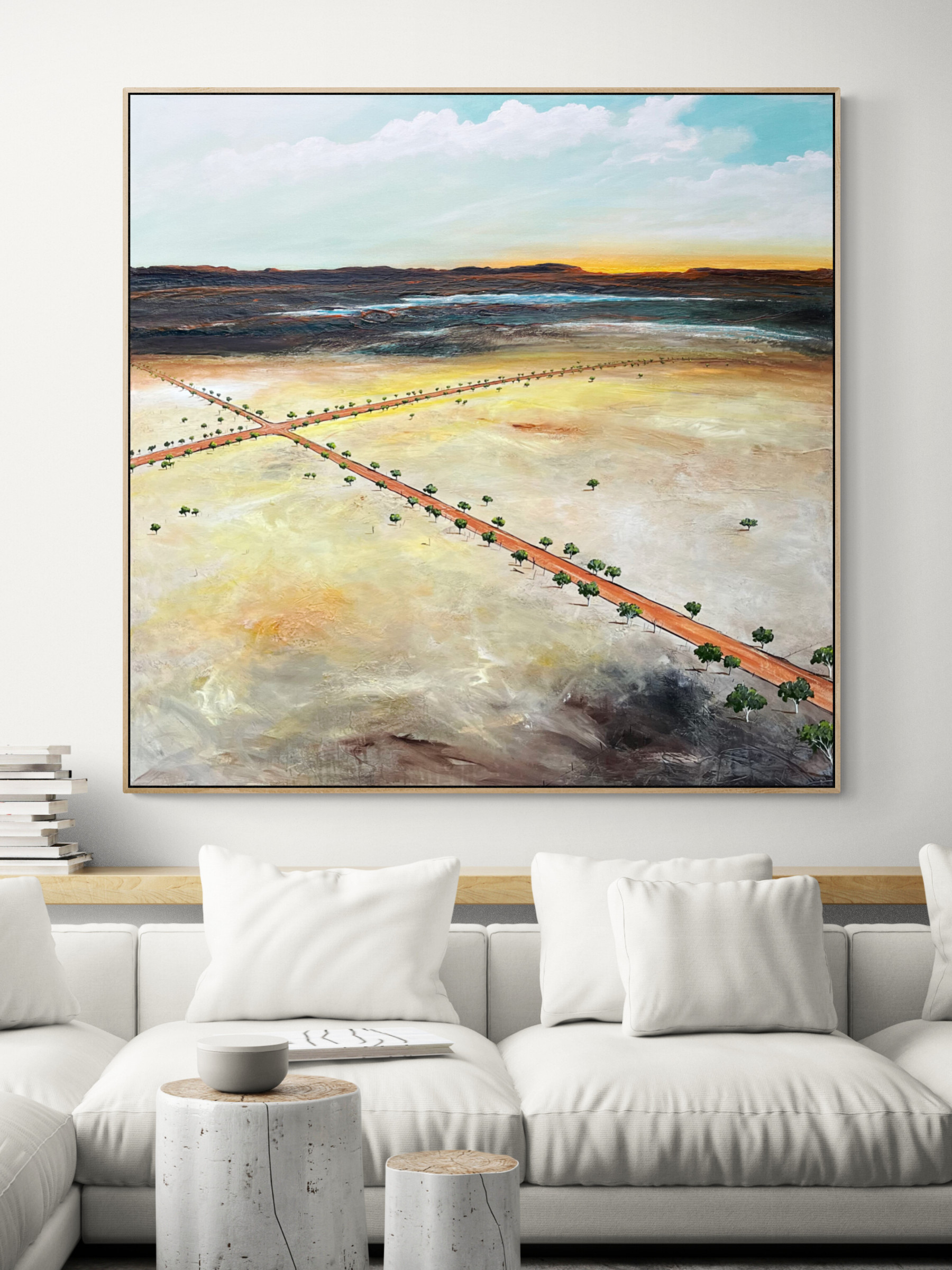 Two long red dirt roads cut across the land in the shape of a quiet cross, drawing the eye toward the dark hills on the horizon and the fading warmth of a golden summer sunset. Scattered trees mark the roadsides, holding their ground in a dry, sun-scorched plain. The textured surface of the landscape holds a memory of water — soft ripples in the earth where rain once fell. This piece reflects the stillness of late summer, when the heat lingers and the land lies waiting.