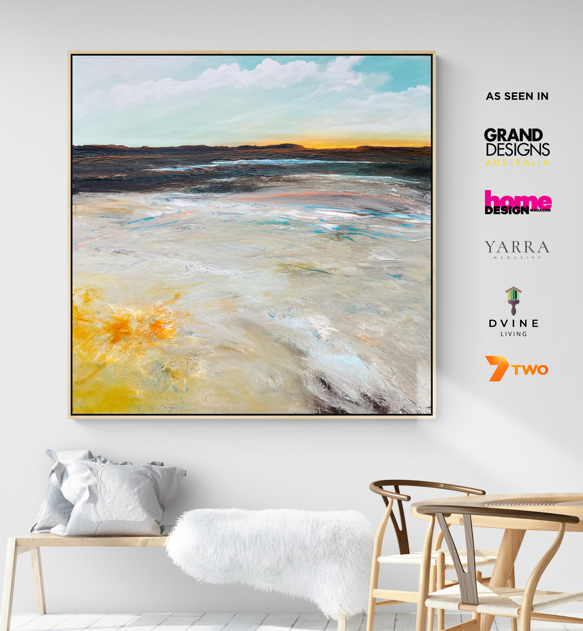 Tania Chanter is an Australian contemporary artist who has the desire to express emotion she feels from nature. Her feelings flow directly onto the canvas in an uninterrupted, intuitive flow; layers, textures and colours blend and evolve until some secret inner part feels satisfied. The depth and richness of the colours, the complexity of the sky – the romantic feeling of stormy clouds, the churning foam of the ocean on those days and the sunlight playing through tall grasses as they bend and wave. From the sweep of the vast landscape down to the bee among flowers, natures inspiration is endless.
