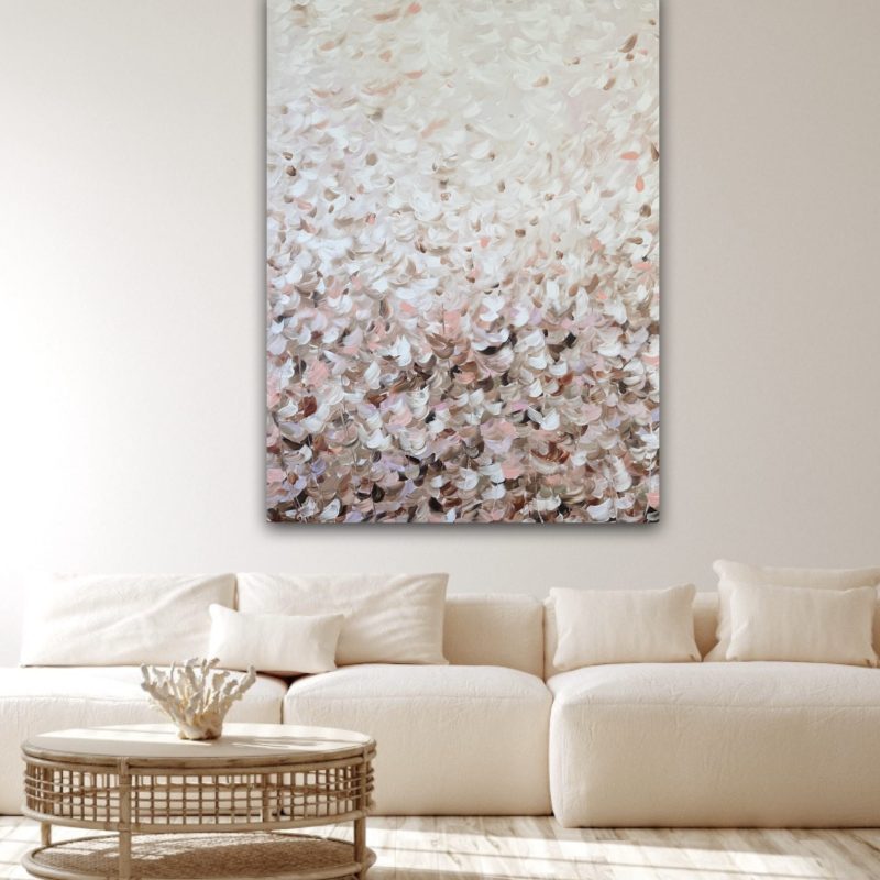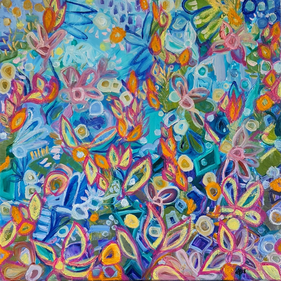 An abstract action painting, where I just let go and allow the artwork to emerge and tell me a story. There is no pressure nor expectation of what it becomes. I really just let go and enjoy the evolution through the act of applying colour and of painting. My abstract pieces are heavily based on my own thoughts and feelings, explored through colour and design.