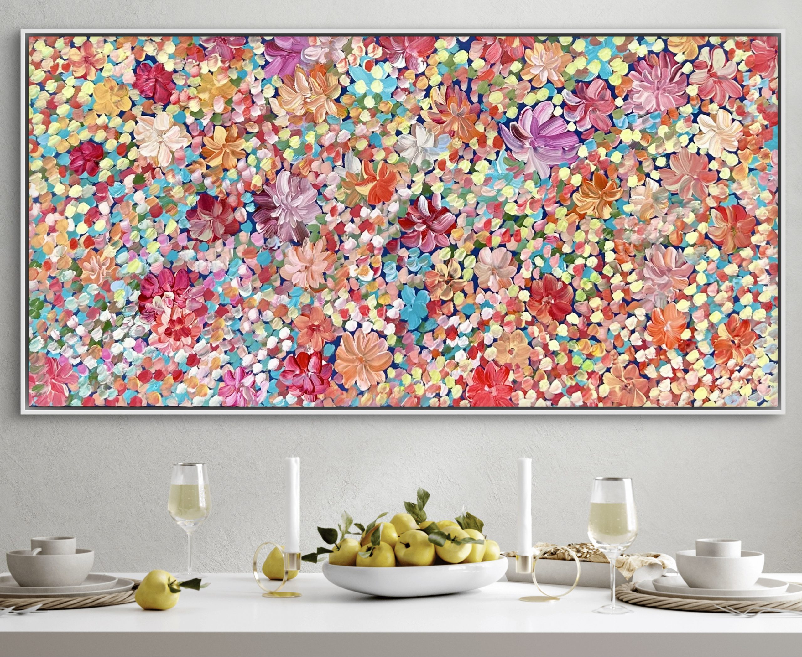 A Â painting with warm and cool colours of flowers and petals flying in the wind creating a garden of colours with lots of layers of acrylic paint. Petals weeping over the garden creating so much movement and rhythms . A very peaceful and tranquil painting with so much depth. The painting does not come with an external frame. The painting is signed and dated at the back and comes with a certificate of Authenticity.