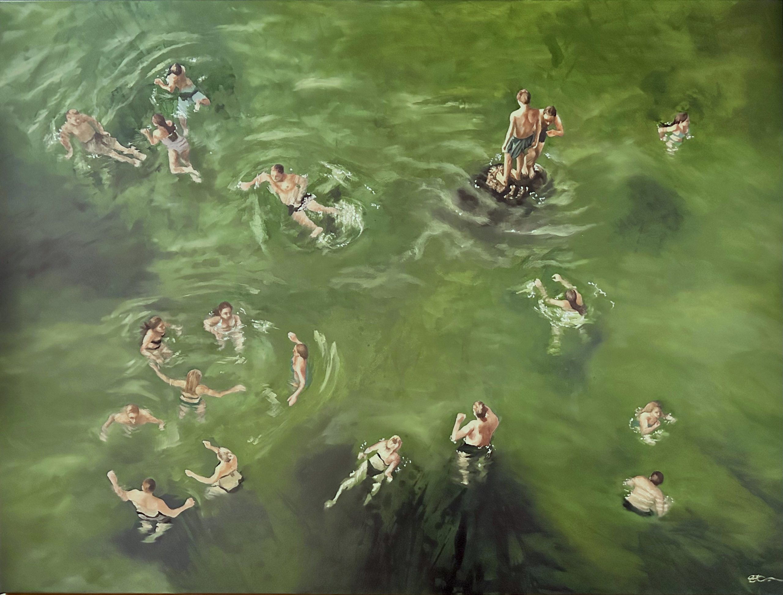 While still exploring the interaction and connection between water, light and form, this series also analyses the sense of disquiet when swimming in deep ocean water. At the same time, the main focus is the quest for refuge, quietness and escapism. These paintings juxtapose the lone swimmer and a few minutes of introspection when alone in deep water against the fear of the unknown. The constant struggle between hyper-realism and having a painterly quality to my work is a conflict I always try to balance; therefore, thick paint and evident brush strokes are present when viewed up close. This piece is painted in professional oil paints on a museum-quality canvas and finished with edges painted and varnish for protection. It comes framed, in a natural timber floating box frame, ready to hang and includes a certificate of authenticity.
