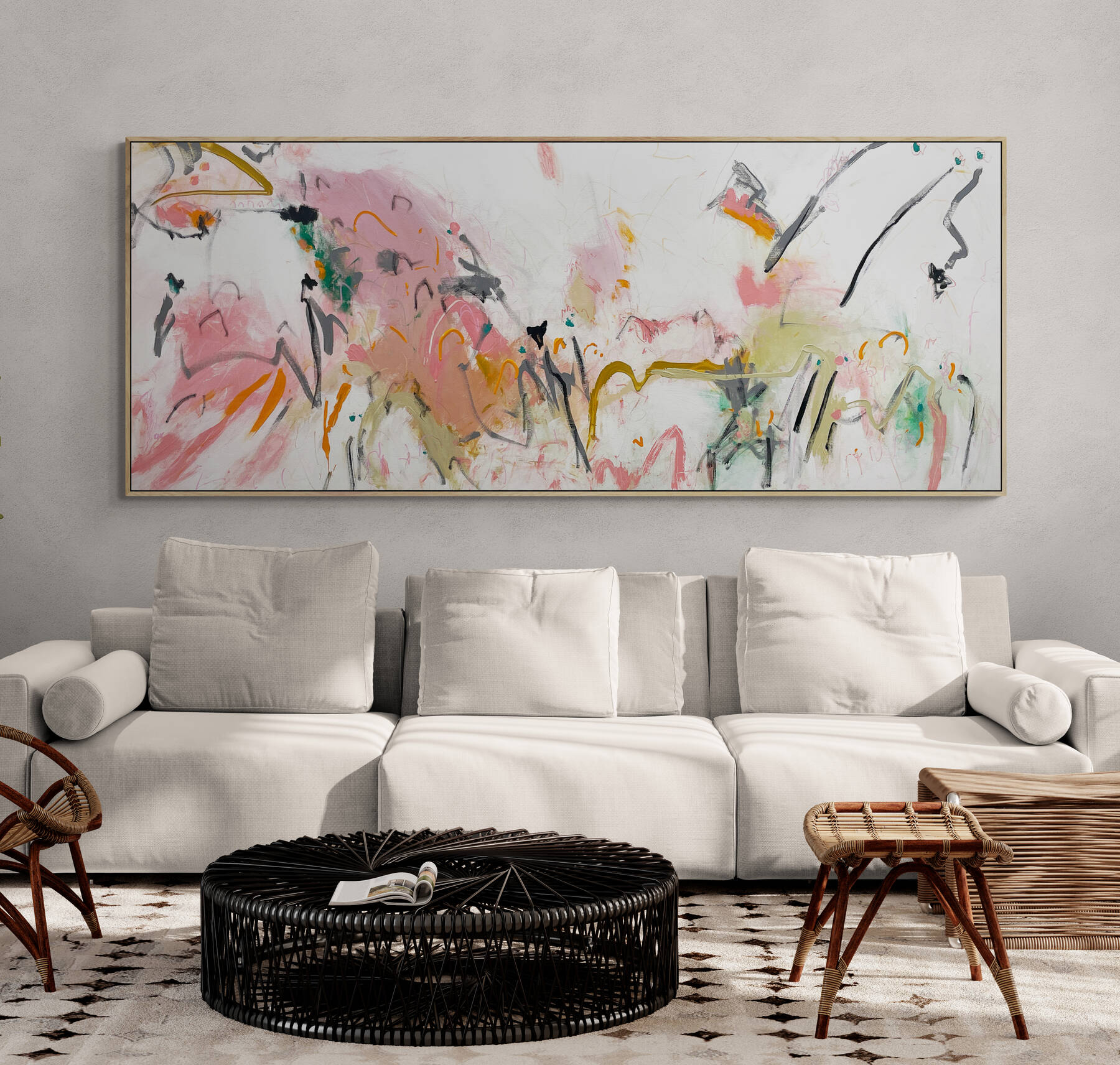 It’s intriguing mark making and texture combined with its beautifully balanced palette of apricot, orange, blush, pink, sage, olive, green, black, grey mixed with white, beige and neutral tones.