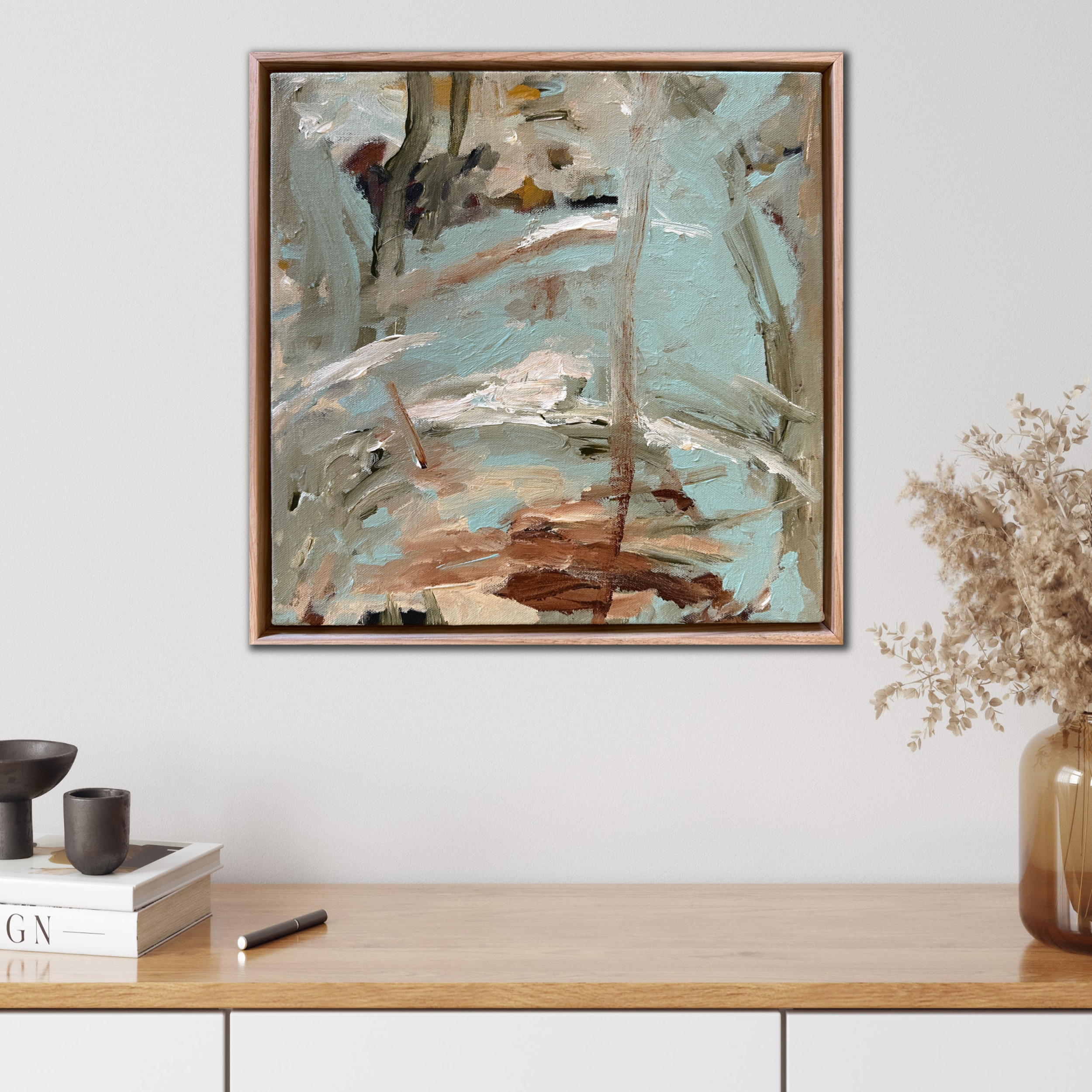 River Crossing by Kylie Sams – Original abstract painting in acrylic paint on cotton canvas, framed in natural oak.