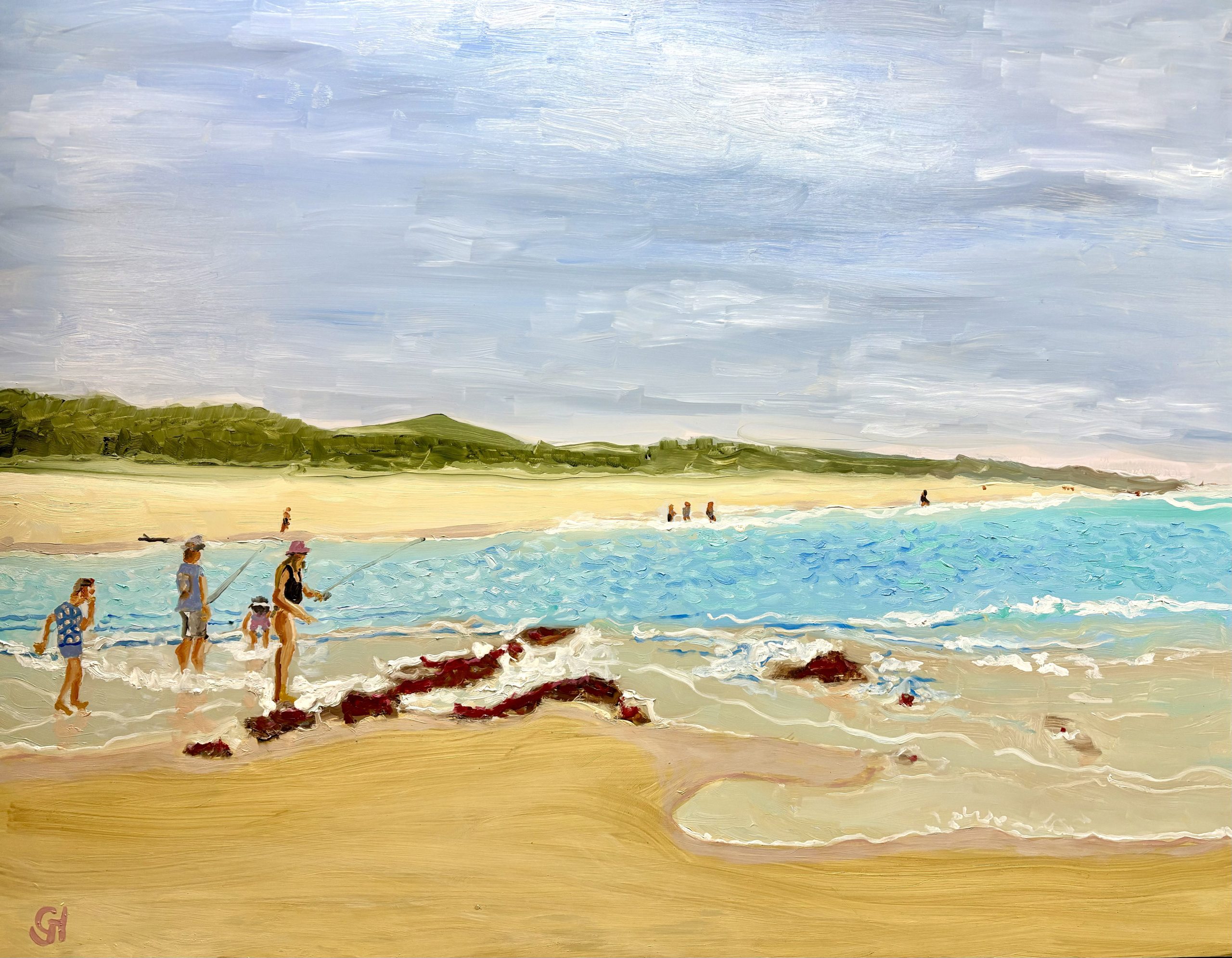 A family are fishing on the southern bank of the Corindi River mouth at Red Rock, while others have cast a line out from the northern shore. this is an original oil painting from my observation of this scene last summer 2024-2025.
