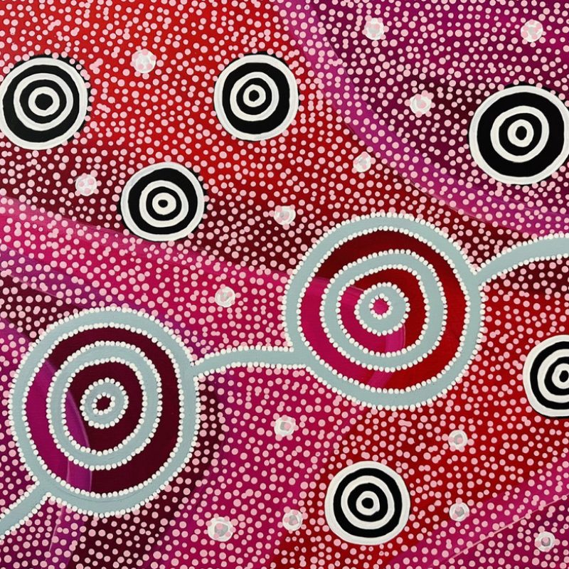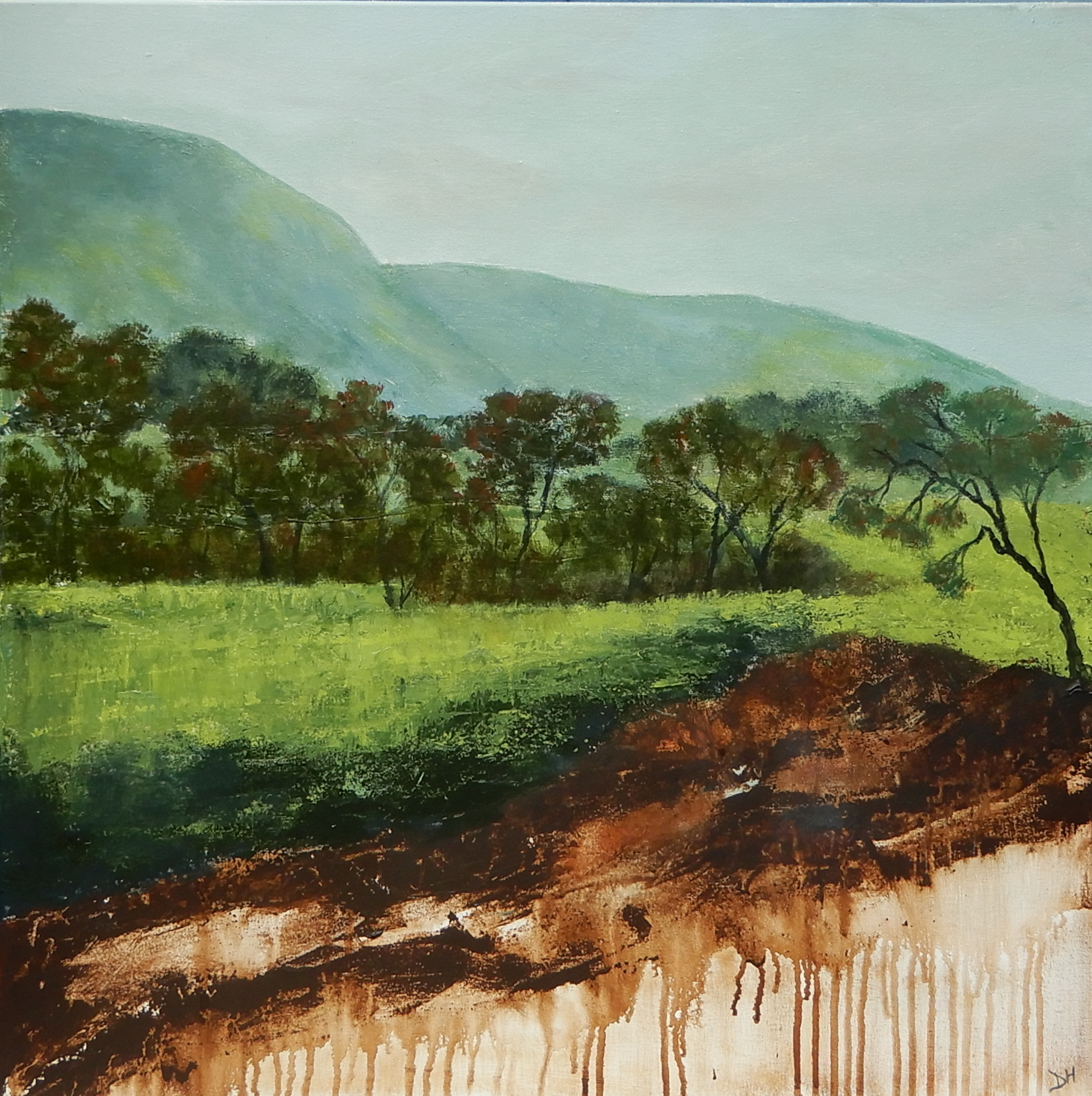 The view over this Riverina farm really took my eye – the lovely contrast of new lime green shoots on the ground, brown and reddish tones of foliage against the pale blue backdrop of distant hills and the dramatic hill in the foreground inspired a painting. I used a palette knife and a scumbling technique with brushes to achieve the differences in form.