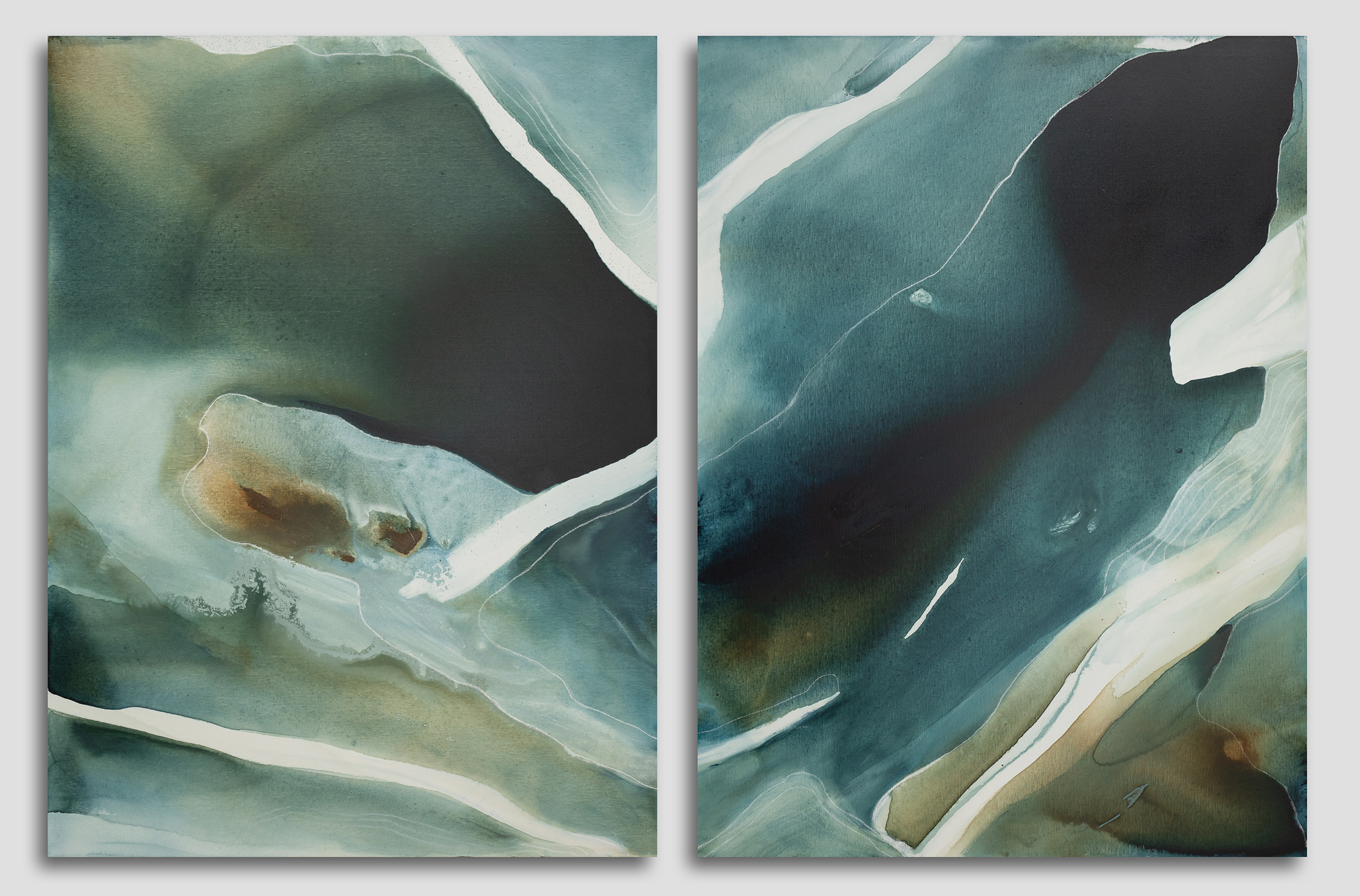 Riviera (diptych) by Dinah Wakefield is inspired by the light, the colours and the natural beauty of the Noosa region of Australia. “What I love most about Noosa is the interplay of light. From the oceans to the clouds, to the river estuaries and the hinterland, this canvas unfolds before me every day and finds expression in my paintings”.