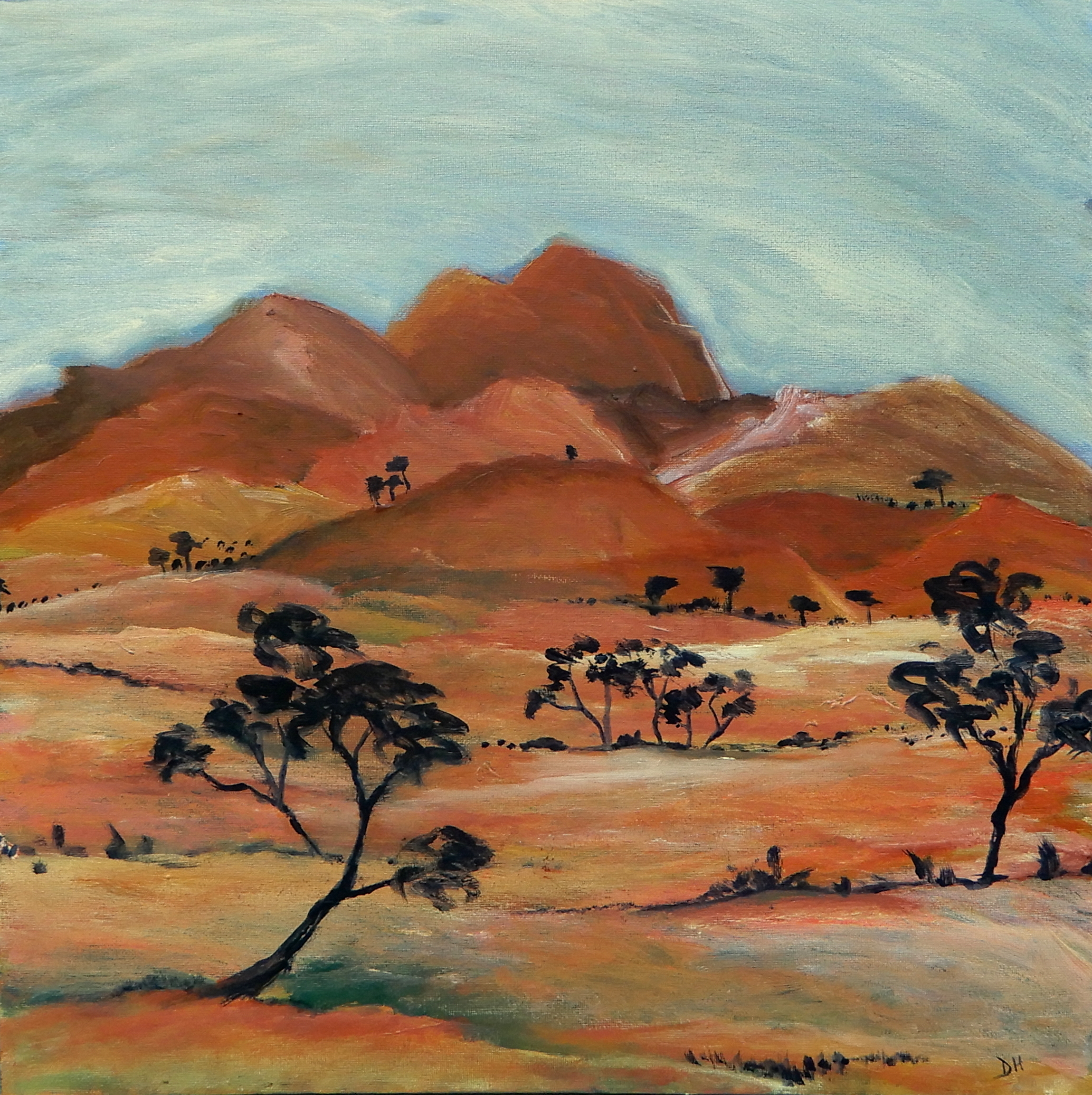 The West MacDonnell ranges loom over the road to Ormiston Gorge in western Arrernte country, bold and beautiful. This artwork is part of a small body of more figurative works inspired by the landscapes around Mparntwe/Alice Springs