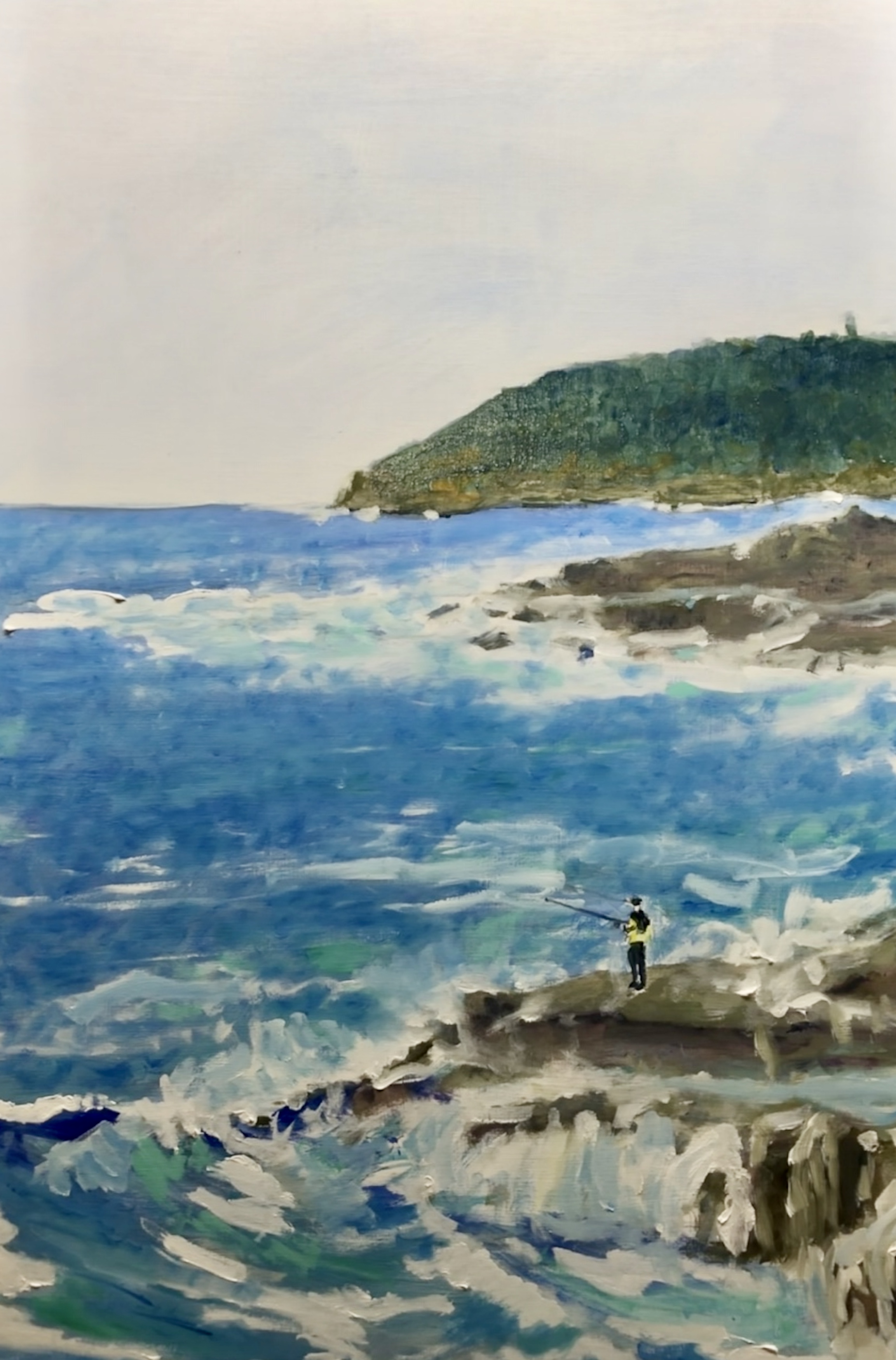 A lone fisherman fishing from the ocean rocks. This is the coastline between Curl Curl and Freshwater on Sydneys northern beaches. It is looking south towards North Head, jutting out in the distance. Oil paint on cradled wood panel H60 cm x W 40 Cm X 2cm, unframed, sides white, wire on the back ready to hang.