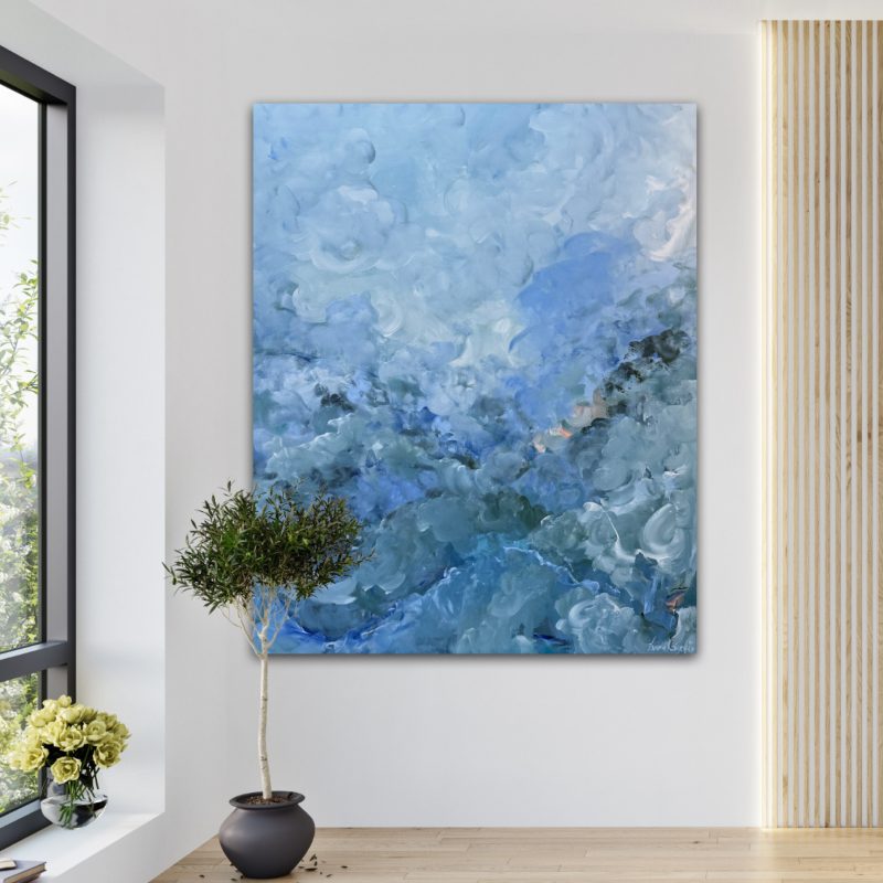 This original Mixed Media Artwork was created first by layering paint and recycled paper to build up the Abstract background effect.