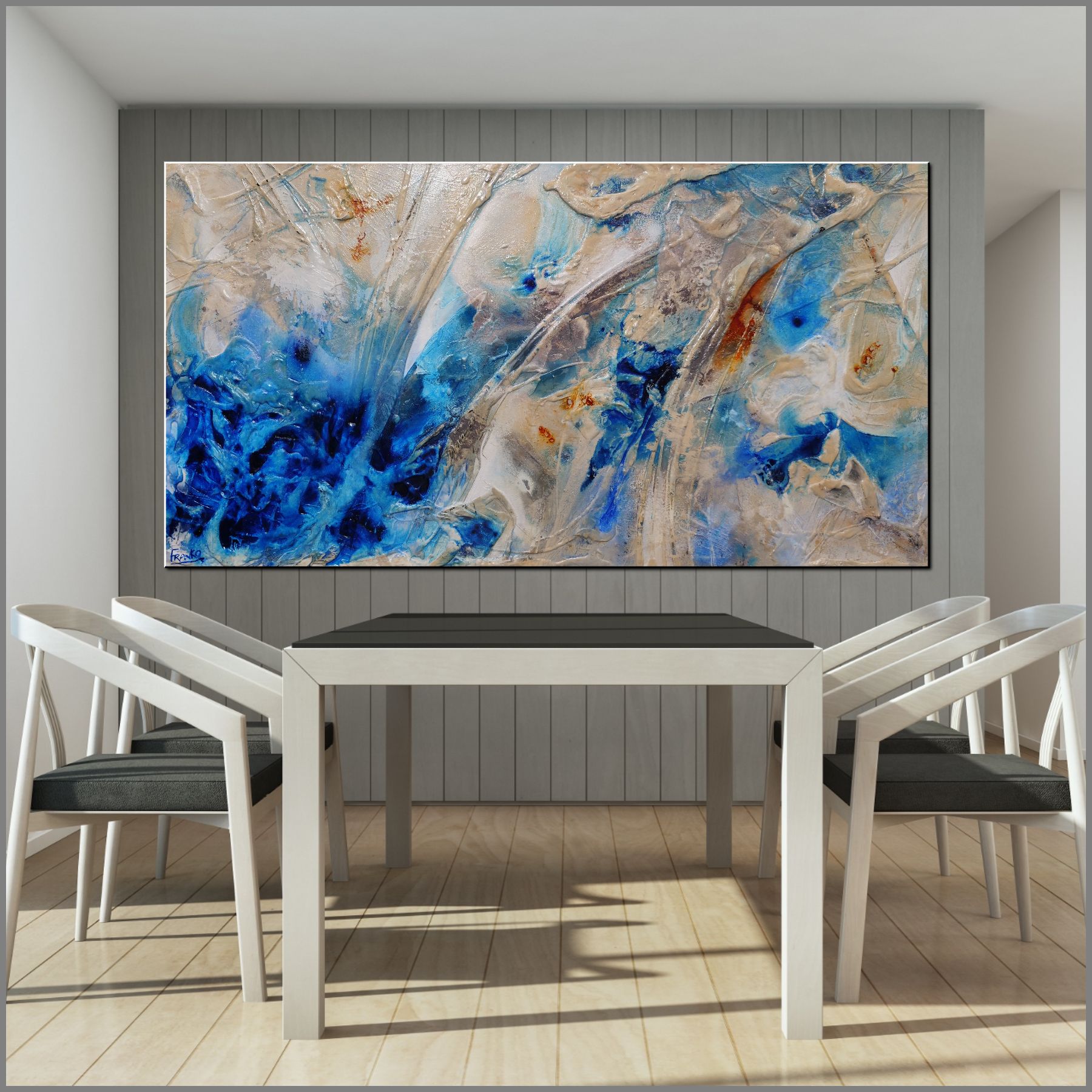 Blue, white, cream, rust and grey acrylics, oils and inks… heavily textured and layered…