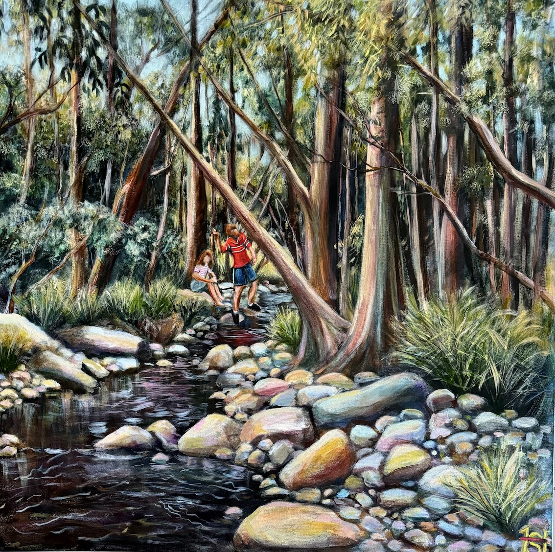 Sue primed the canvas with a peachy shade of orange and drew in the creek and trees bearing in mind that the centre of focus should be in the middle. Once the rocks, trees and creek were painted Sue added the two central figures and touched up areas of light and dark and she added the ripples and reflections in the water.
