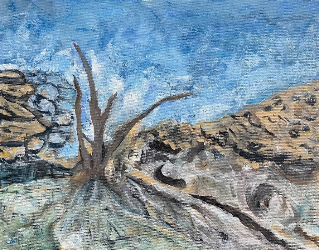 Inspired by a visit to Rocky Point Island, at Balmoral Beach in Sydney. A lone leafless tree hangs on for dear life. Looking down at the water crashing against rocks has a rather mesmerising effect, a desire to get as close to the edge without falling.