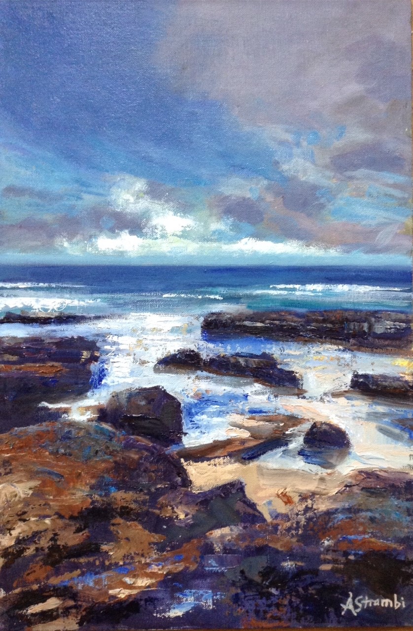 Rocky Seascape – Original oil painting by Anne Strambi. This painting was inspired by the rocky shore line at the end of Pippi Beach where I often walk. The shapes of the rocks and the light on the water invited me to paint them!