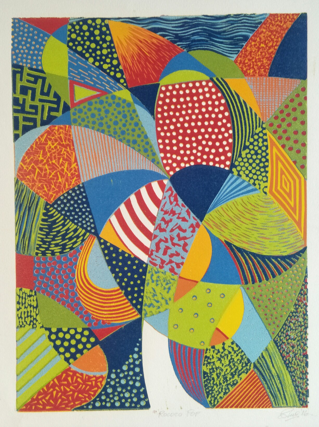 Rococo Pop by Clive Dickson – Limited edition (10) lino cut print. An abstract interpretation of the confronting flatness and bold colors associated with Pop Art. There is a playful dialogue between contradictory textures, shapes and colors held together within graceful interlocking shapes. Harmony has ultimately been achieved, despite the number of unlikely relationships that are presented together.