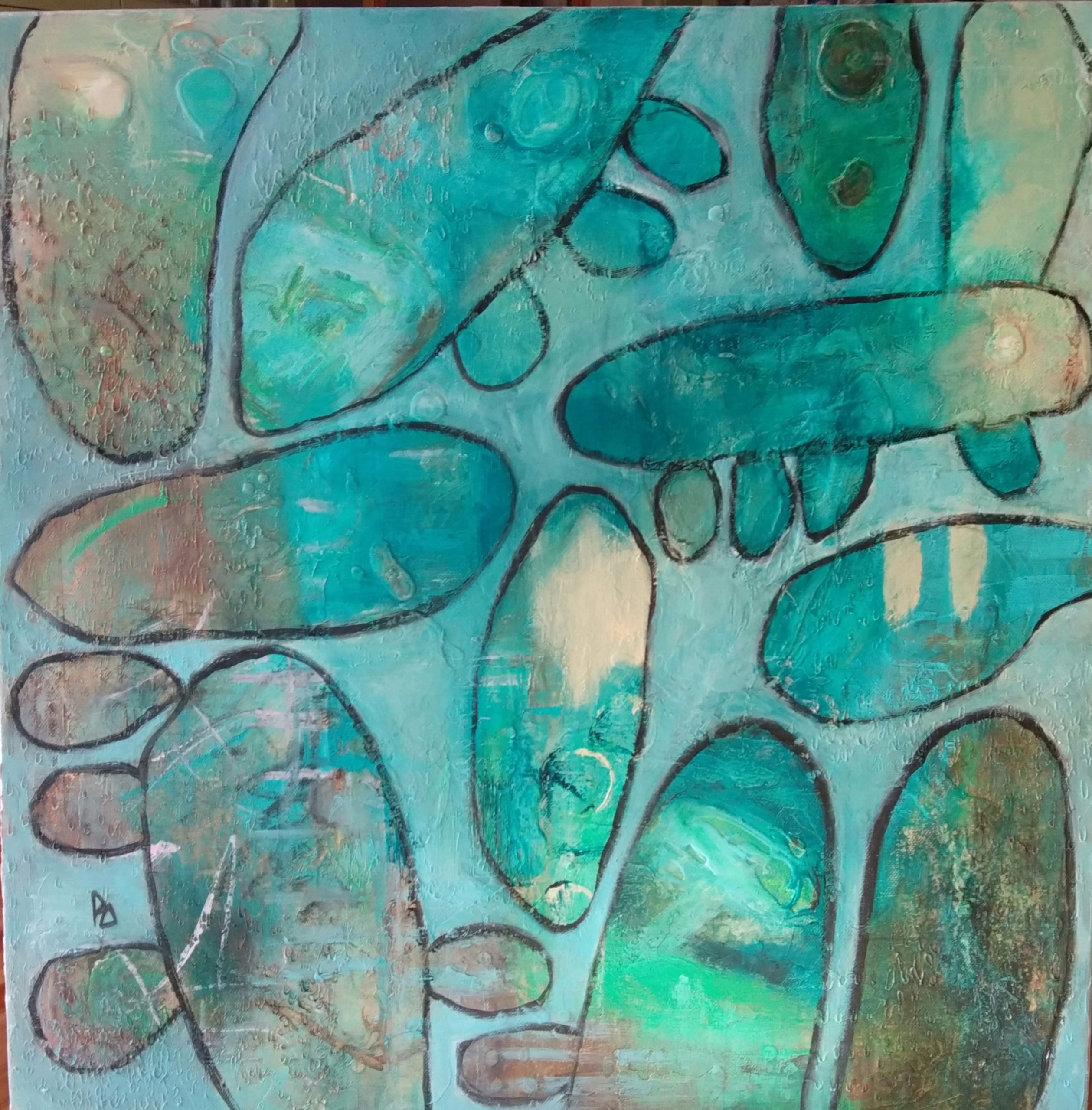 Acrylic textured abstract painting. Ready to hang. Relaxed colours calm and cool. Bold form.