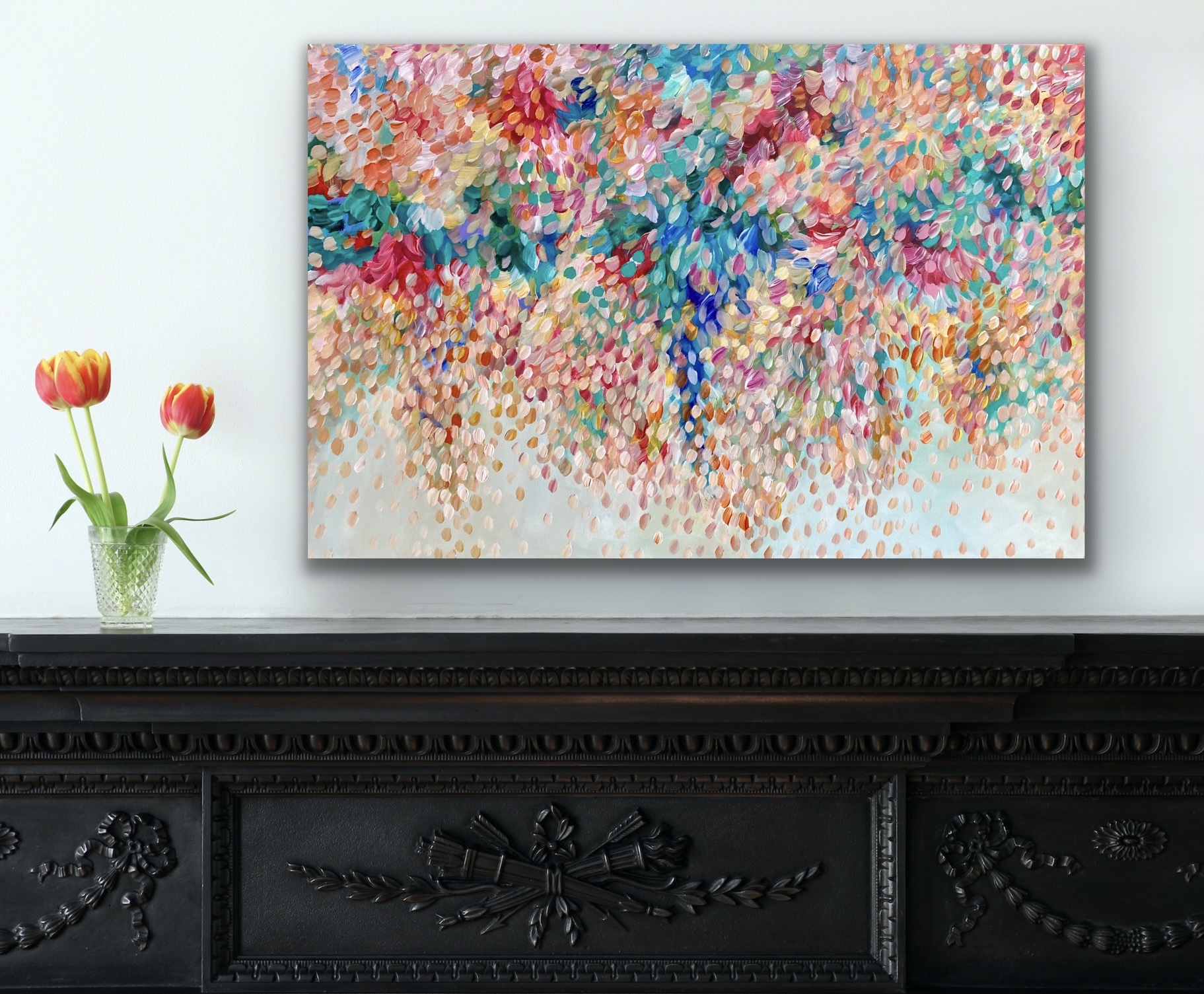 Romance by Theo Papathomas – AÂ painting with lots of layers of colours of petals covering the hills. This is a place you can let your self go and dream and feel peace. The landscape becomes a bouquet of petals dancing over the land. I tried to create this beautiful composition of colours of the landscape and creating so much depth to the painting . Capturing the beautiful colours of the petals, foliage of the trees like musical notes dancing over the landscape . The Forest comes to life with lots of rhythms and sounds of the petals. A very peaceful and tranquil painting. The painting is signed and dated 2021 at the back and comes with a certificate of Authenticity.