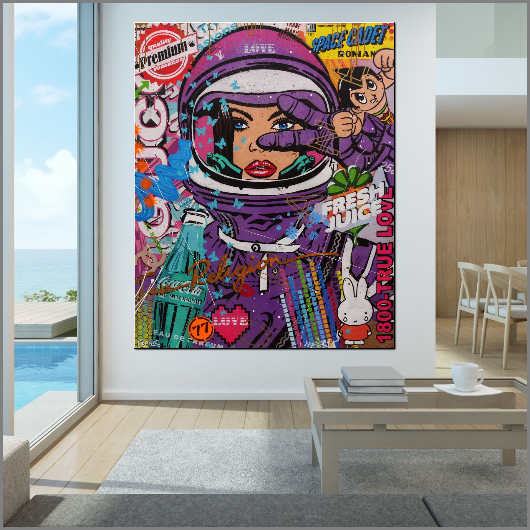 I create all of my “Urban Pop” pieces with a partial textured base and in a grungy manner to replicate something of an “urban” wall type look. I use some forms of Brandalism to replicate advertising on walls. Throughout these pieces, you will see disingenuous tags like “Genuine Romance” “ 1800-True Love” “Never seen before” “This will change your life” “Genuine Taste” etc etc to poke a bit of fun at the constant bombardment we all get of things that are bordering on truth and outright pulling the other leg. I use a lot of this for balance, layering and colour within the canvas as well.