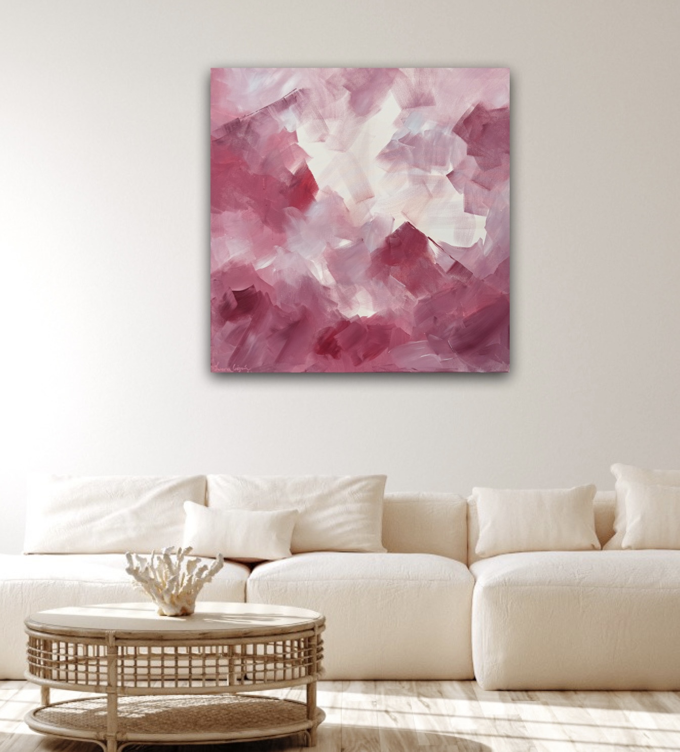 This artwork features a beautiful blend of soft and deep pink tones and white highlights creating a dreamy cloud like effect. The brushstrokes are expressive and layered, giving the piece depth and a romantic and ethereal feel.