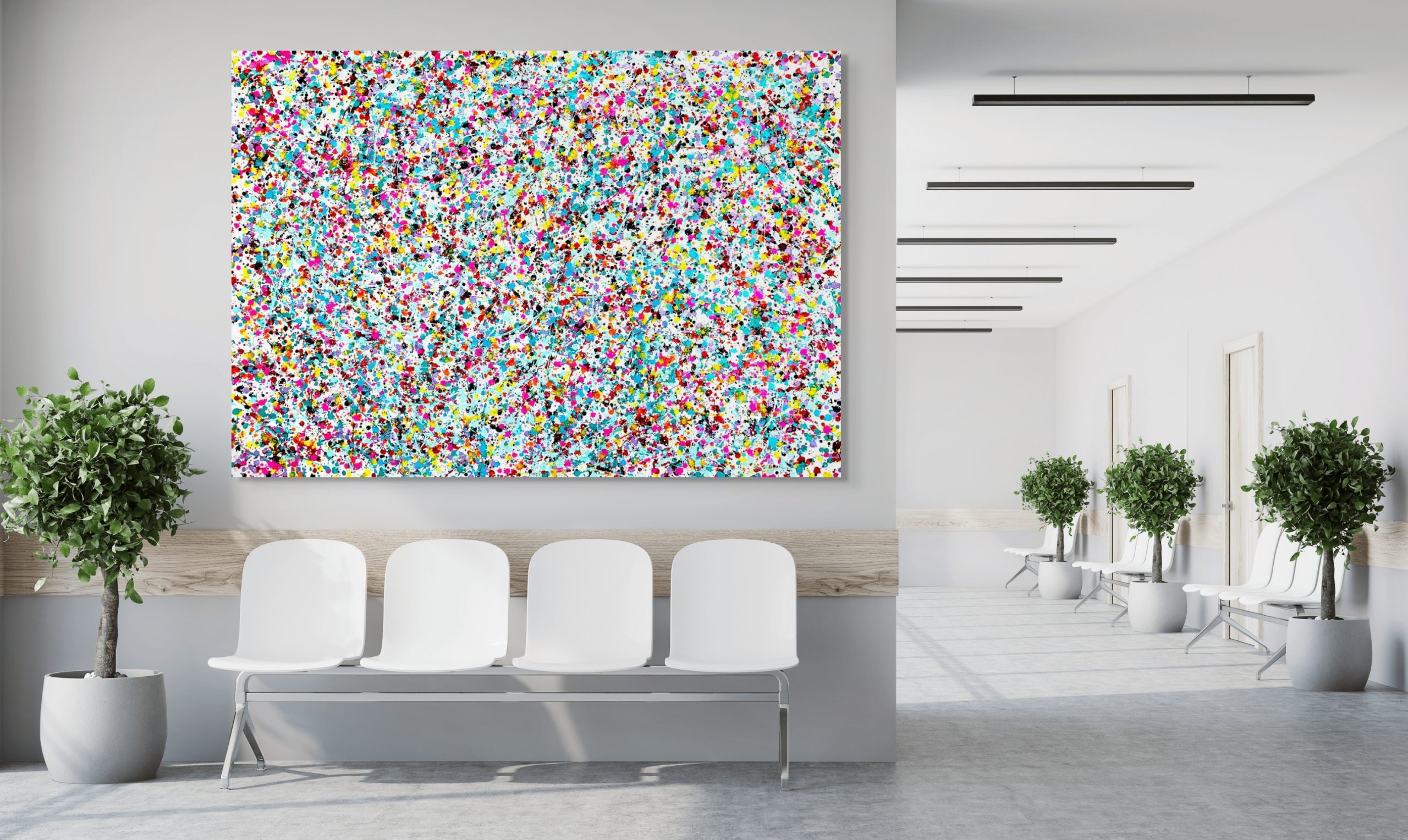 This artwork is painted on professional-grade canvas stretched and sealed with varnish. The canvas has dimensions 200 cm in width by 140 cm in height. The painting wraps around the sides of the stretcher, so the sides are painted in the same style as the surface. As such it does not need a frame.