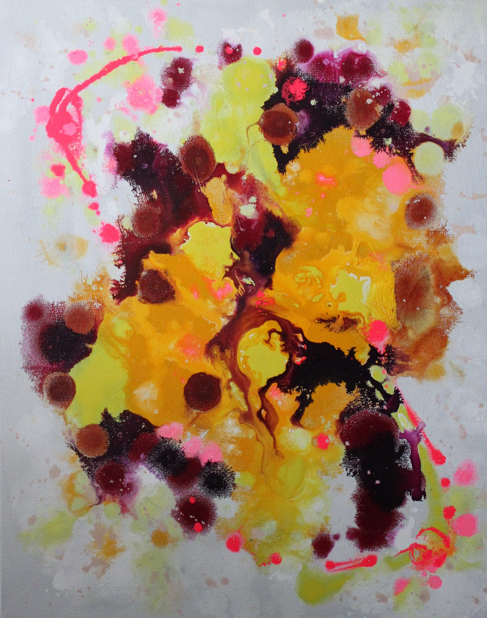 Room Without a Roof symbolises the joy of freedom and a life without limitations. In this painting, the bright yellow is offset with deep red violet splashes.  Areas of fluorescent pink lead the eye through the composition.