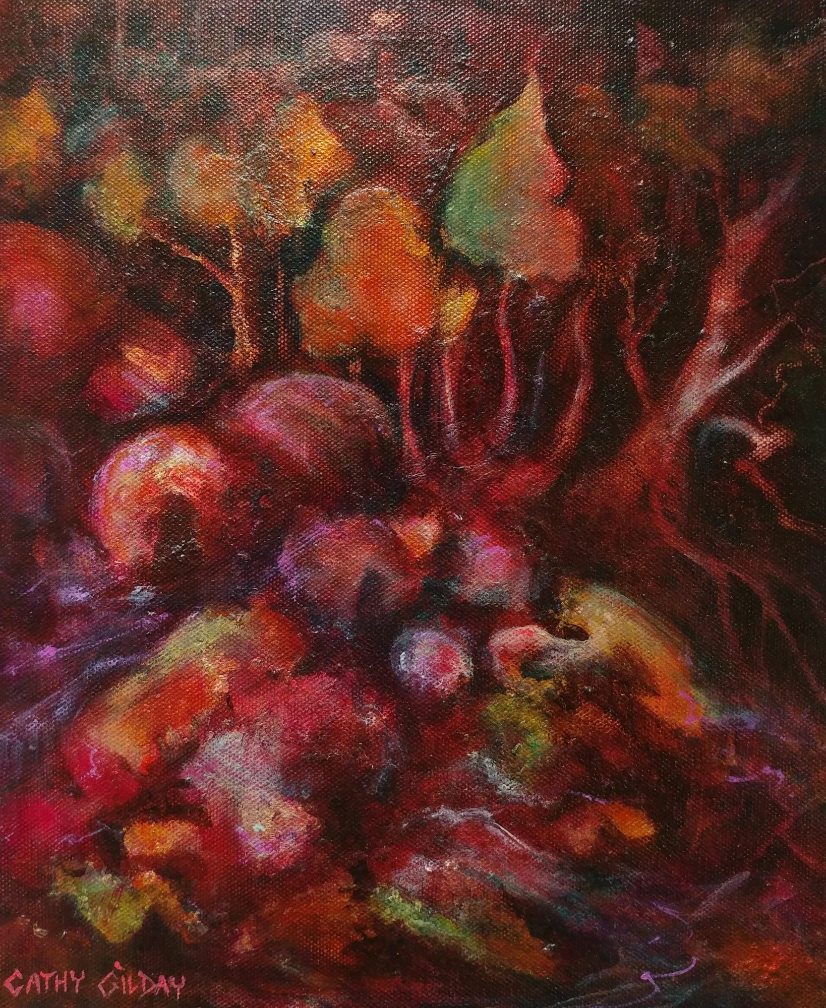 Rose Coloured Glasses by Cathy Gilday – I love to paint fantasy landscapes. This little piece has been bathed in a beautiful rosy glow and it represents a place where I would love to be. It’s a type of therapy art and a form of self expression. Artists quality paints, mediums and varnish used. Sides painted, signed front and back, sealed and ready to hang.