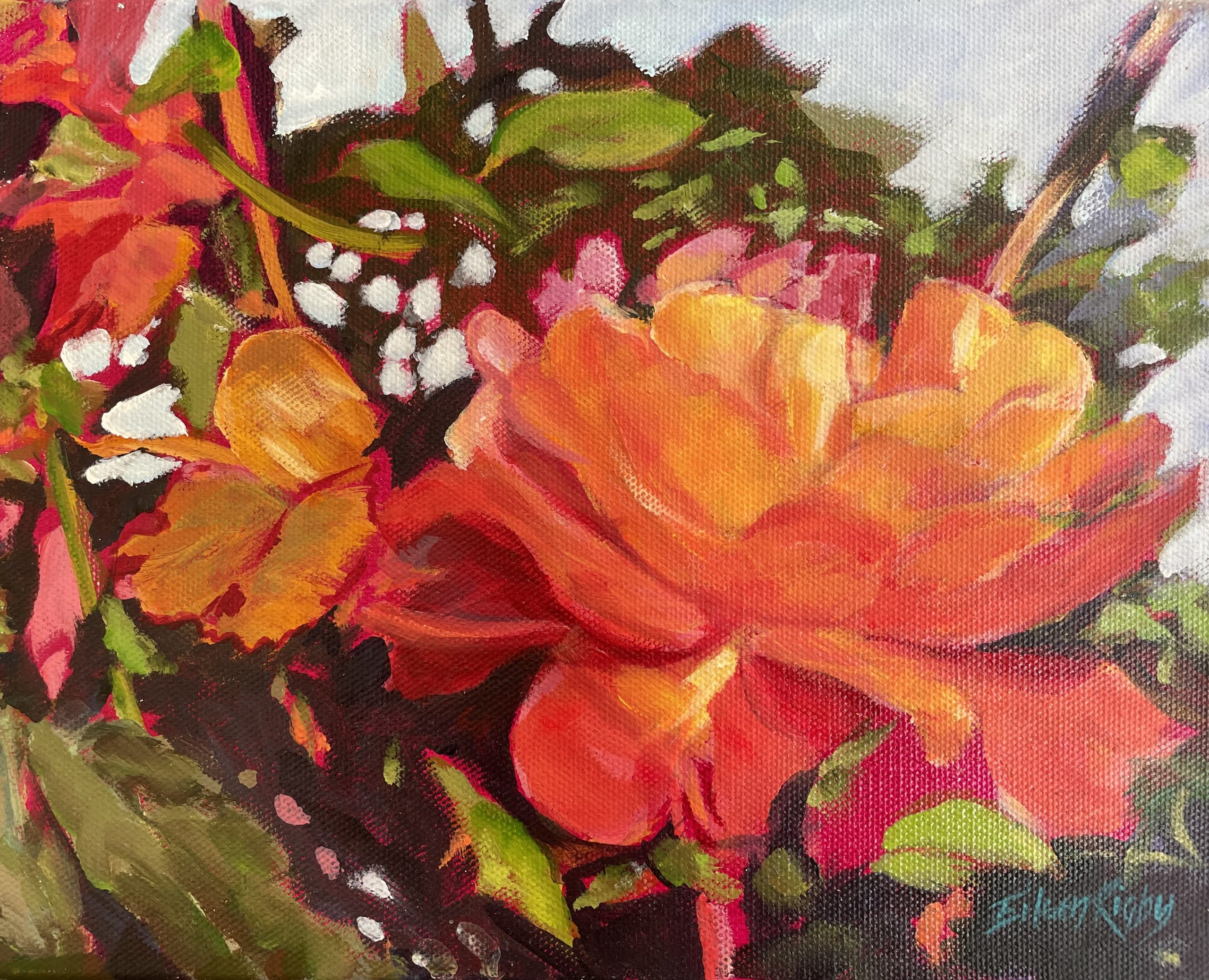 Artistic inspiration comes from many sources with all the senses playing a huge part in its pursuit. The fragrance, the colour, the delicate petals under a clear blue sky drew my attention to this corner of the garden and invited itself to be painted. Original in professional acrylic Paint on canvas, stretched – ready to hang. Unframed. Protected with two coats of matt varnish.
