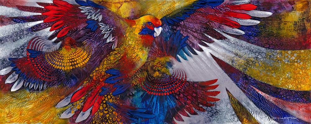 Rosella Jammin’ bursts with colour and movement, celebrating the joy and energy of the Eastern Rosella in flight. One bird takes centre stage, vividly rendered, while two more are hinted at through abstract, playful mark-making that suggests motion and rhythm. Inspired by the label of a Rosella brand Melon Jam tin glimpsed in childhood, this painting channels a bold, illustrative style that remained in memory for sixty years until technique finally caught up with imagination. Richly coloured and textured, the work combines nostalgia, whimsy, and painterly skill, transforming a cherished visual memory into a lively, contemporary celebration of nature and colour. I reckon my Nanna would recognise it.