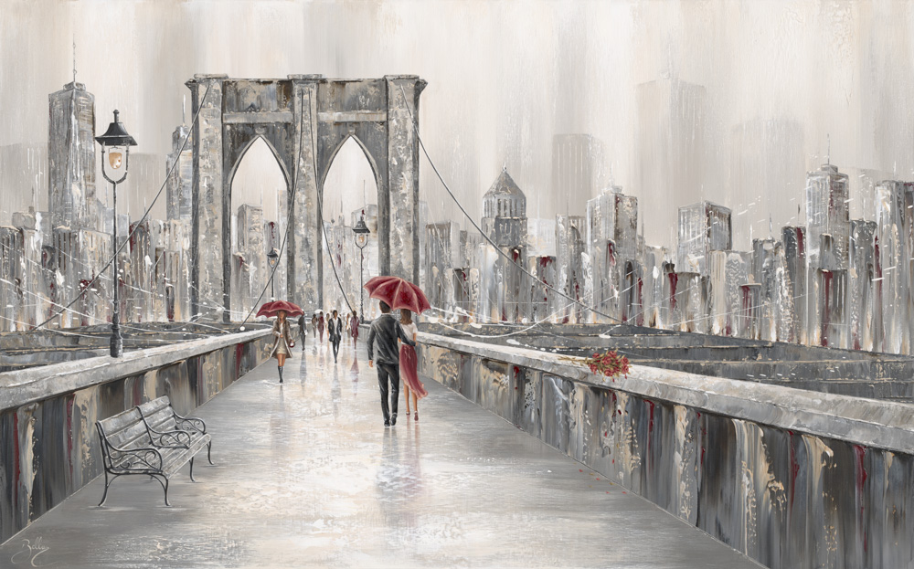 This enchanting painting captures a moment frozen in time, where a couple strolls across the iconic Brooklyn Bridge, sheltered beneath a deep maroon umbrella. Yet, it’s not just their silhouette against the majestic cityscape that draws you in; it’s the mystery of the roses left behind on the bridge’s ledge that truly piques your curiosity.