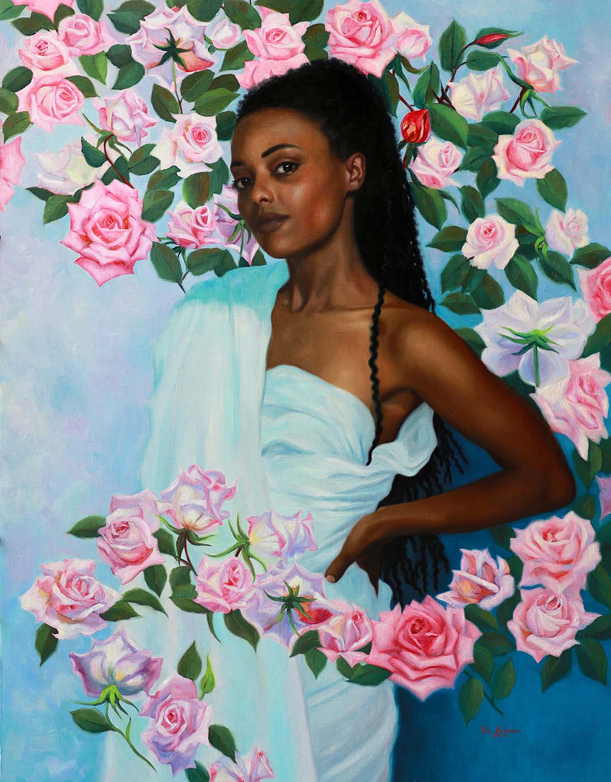 In this painting I paid particular attention to the Roses swirling around my subject, enveloping her in a delicious floating rose garden
