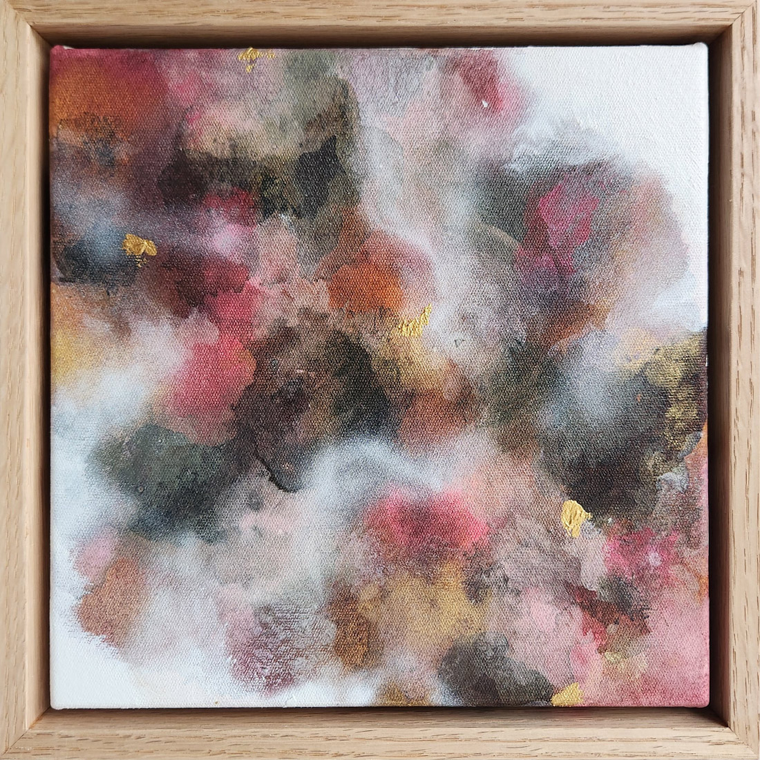 ‘Rosy’Â by Fern Siebler is a muted mini artwork featuring dreamy tones of pink, earthy brown, gold, orange hues. This piece can stand freely, such as on an entry way sideboard or desk, or be hung on your wall.