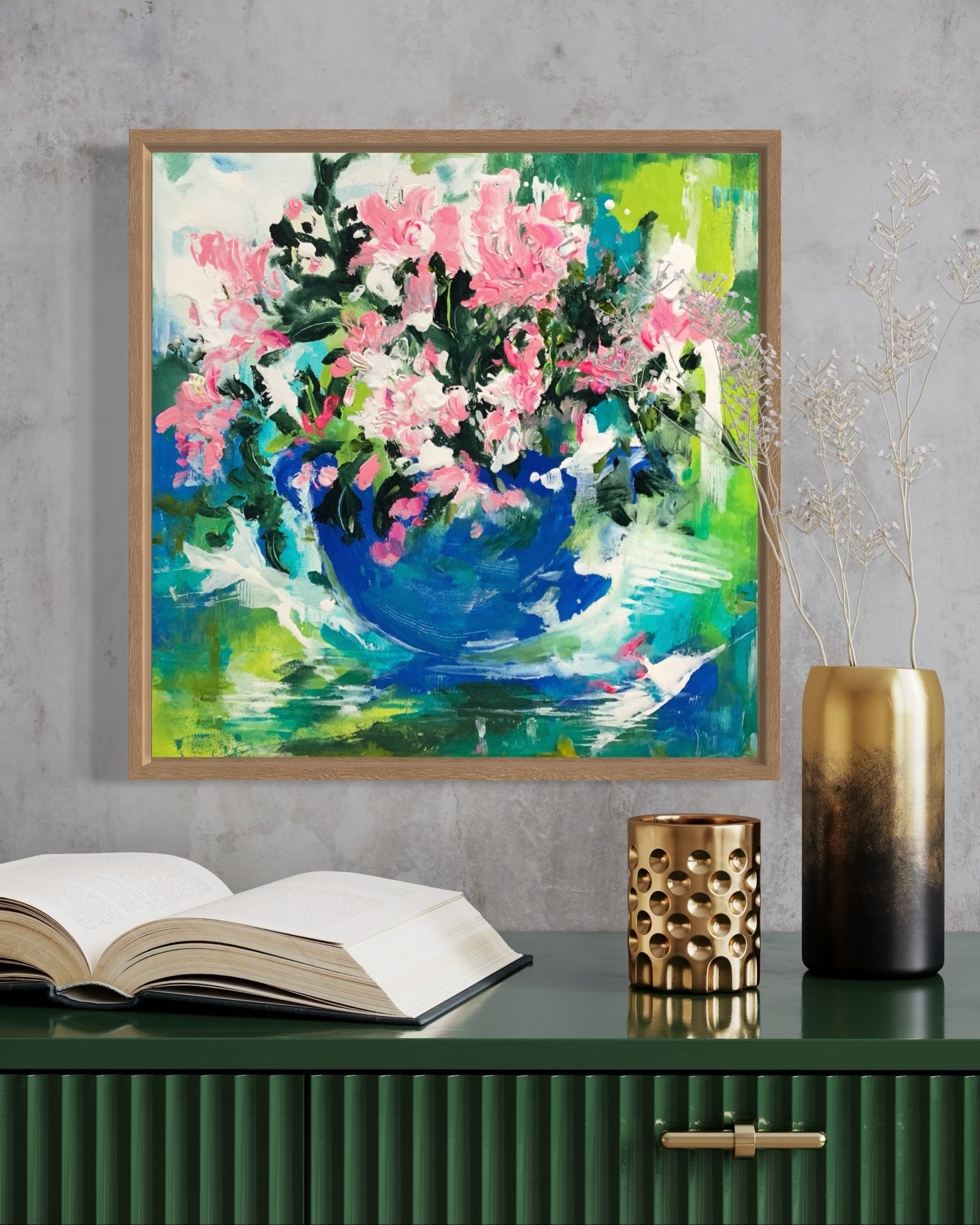 Artwork is gloss varnished for protection and is framed in oak floater frame, ready to hang.