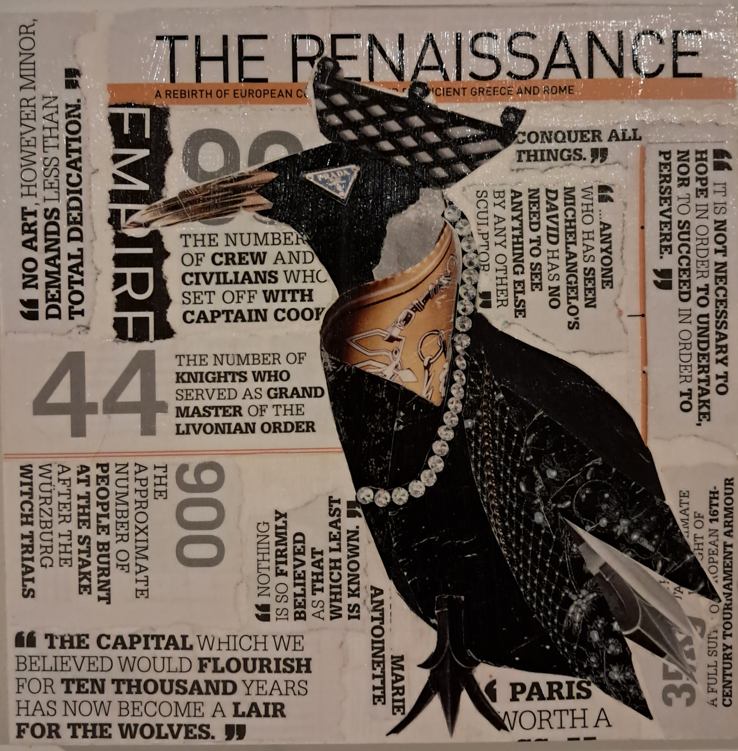 Collage and mixed media. Snippets of royal history with my favourite magpie dressed in high royal fashion.