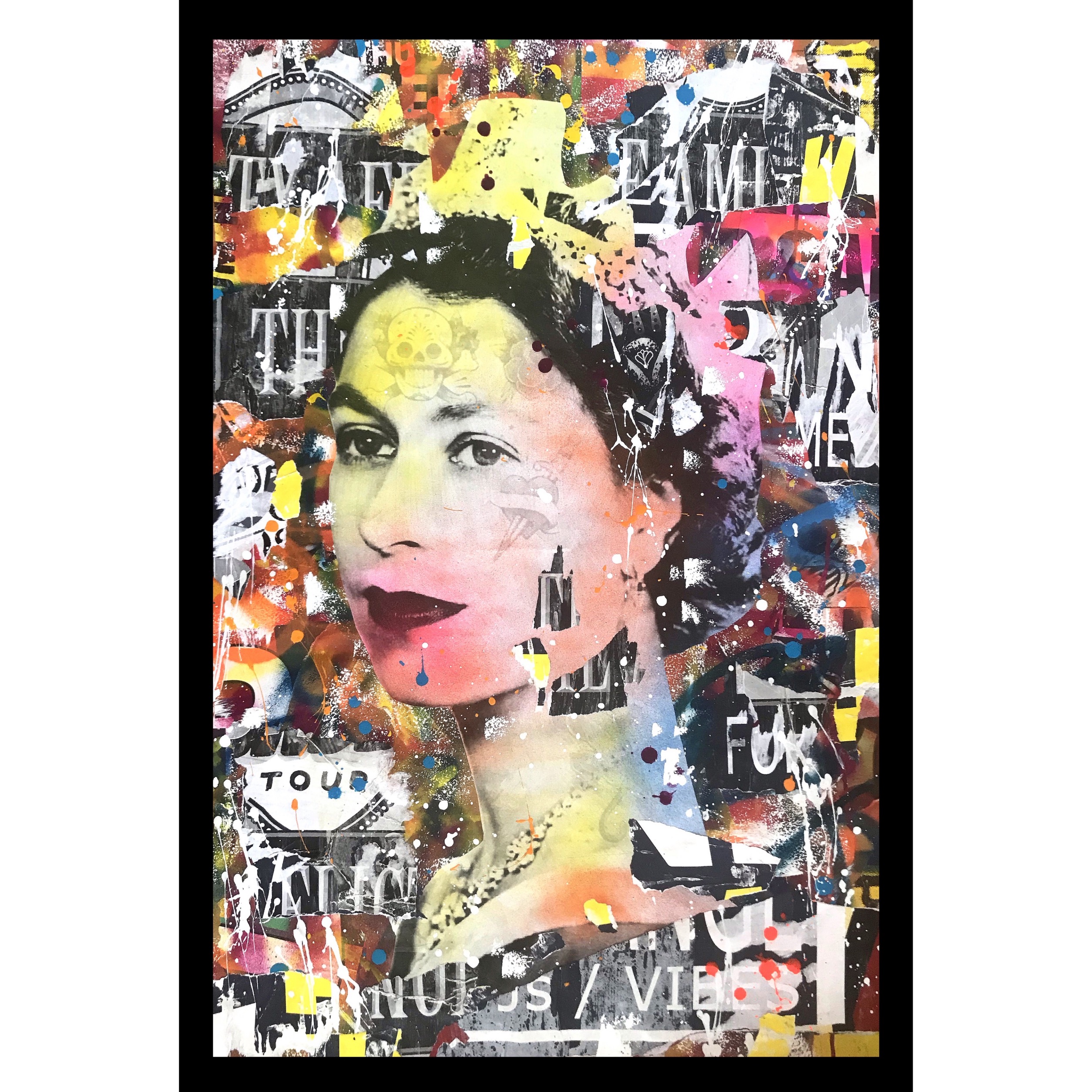 This artwork has a textured finish created by built up layers, paint splatters and torn paper, a visual effect mimicking the look you would see in the street where this effect is created over time. These imperfections are part of the overall look and feel of the finished work.