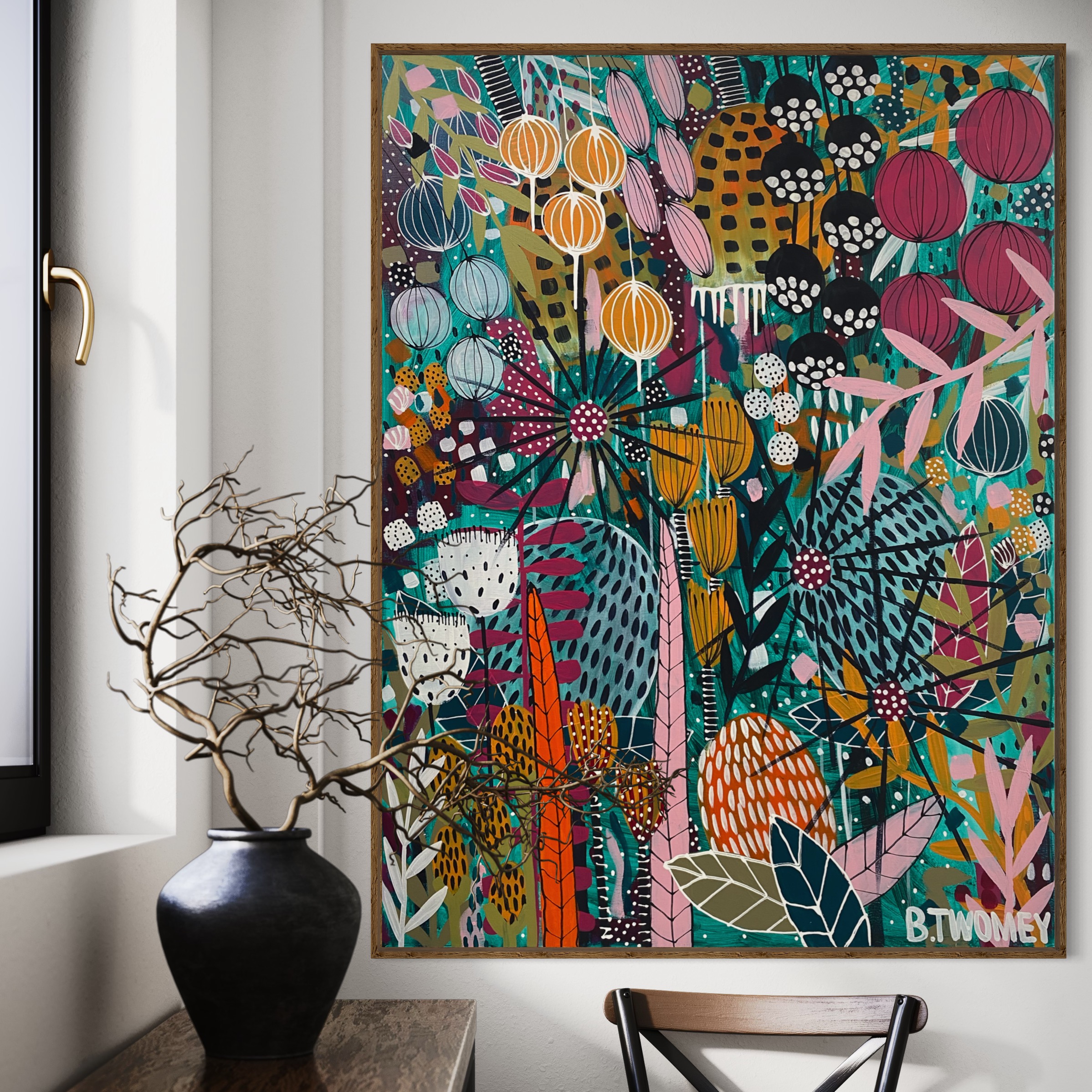 An original artwork on triple primed gallery quality canvas, ready to hang in sustainable hardwood float frame. 122cm x 92cm canvas size (125cm x 95cm framed)